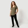 O modelo possui decote V, mangas curtas e comprimento alongado com barra arredondada mais comprida atrás. As fendas laterais ajudam na mobilidade, tornando a peça fácil de combinar com jeans, leggings ou shorts.