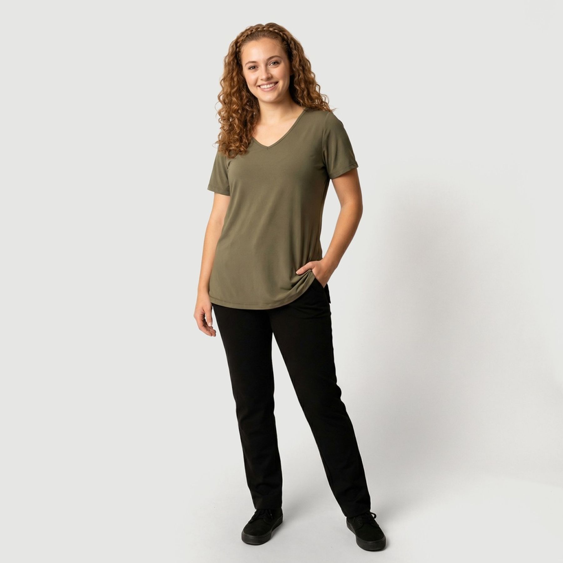 Economia de R$ 17,00A camiseta feminina Del Rio em micro dry liso é ideal para compor produções versáteis com praticidade. Em verde militar, tem malha sintética de composição mista com predominância de poliamida, com toque agradável e bom caimento.