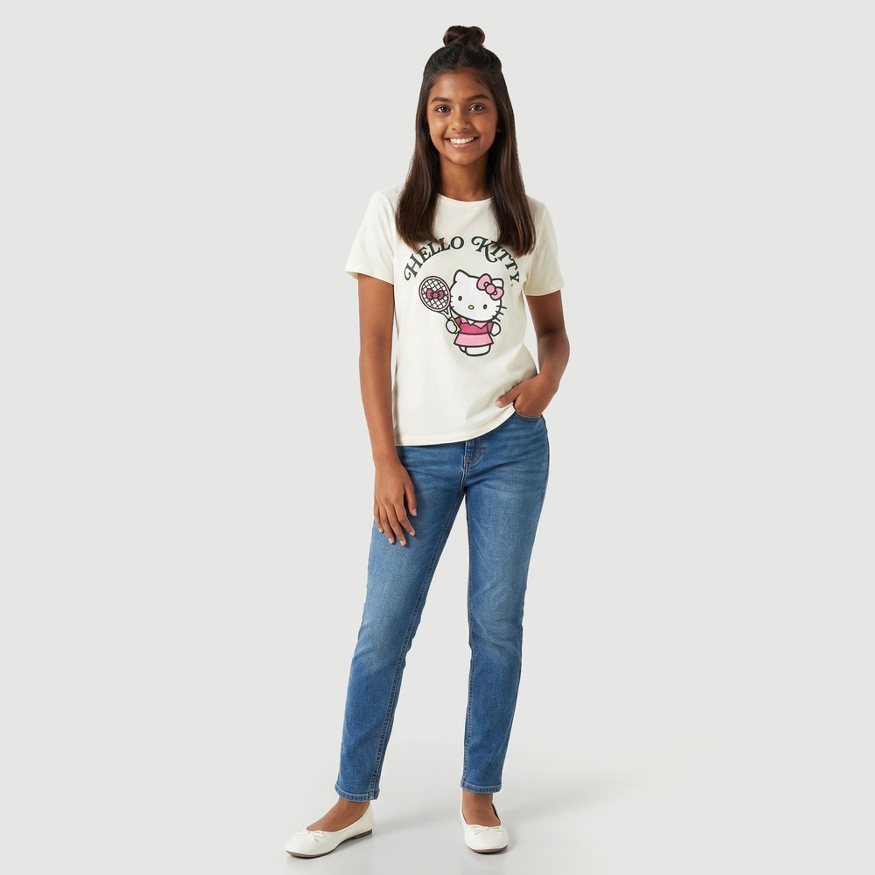 Economia de R$ 3,60A Blusa Manga Curta Estampado Off White Hello Kitty oferece conforto e estilo com estampa delicada.Ideal para compor looks casuais e confortáveis.