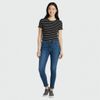 As listras brancas sobre o fundo preto trazem contraste sofisticado e versátil, permitindo combinações fáceis com jeans, saias ou calças.