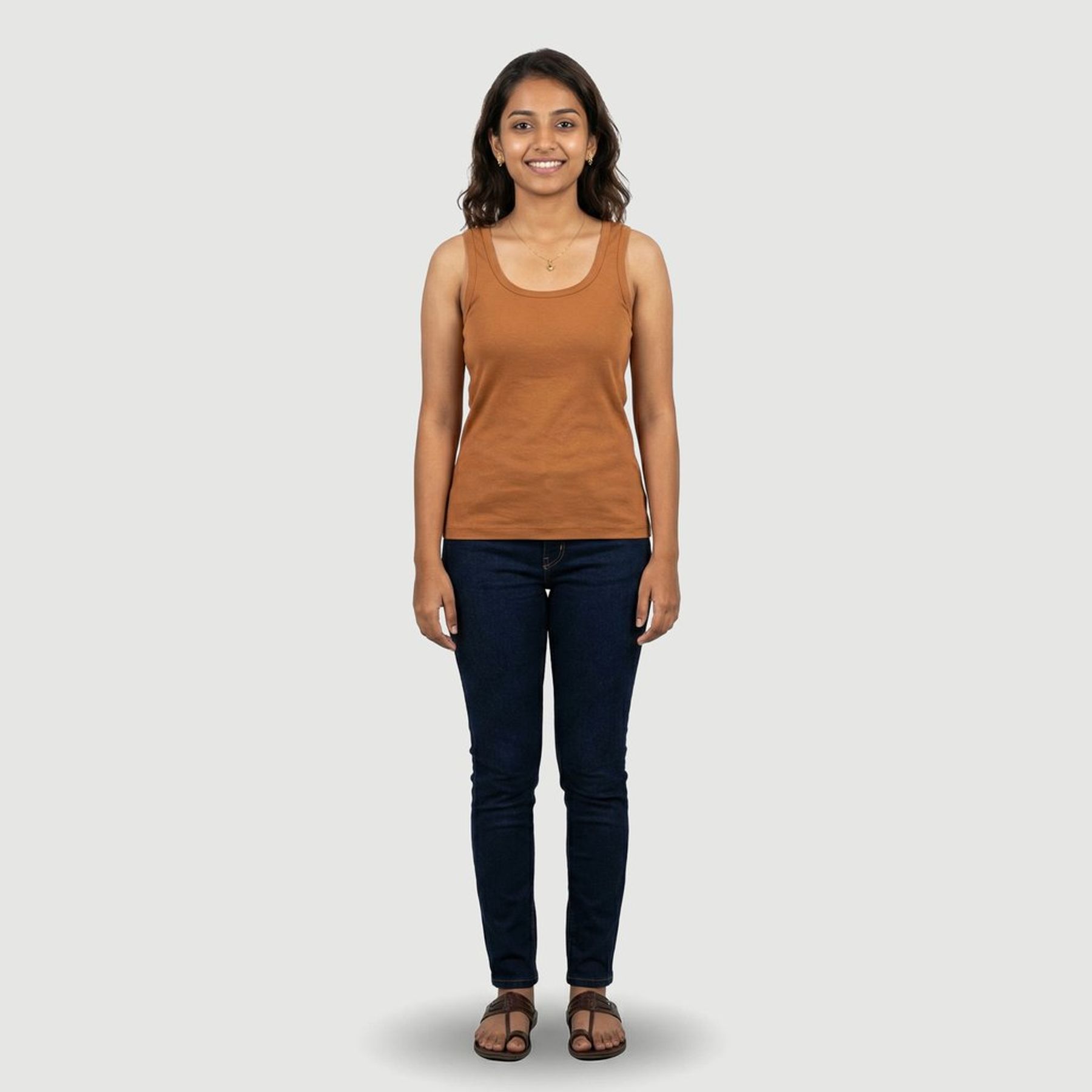 O modelo sem manga conta com alças largas e decote arredondado, além de gola com acabamento em viés e barra com costura simples, mantendo um visual limpo e versátil para usar com jeans, saias ou shorts.