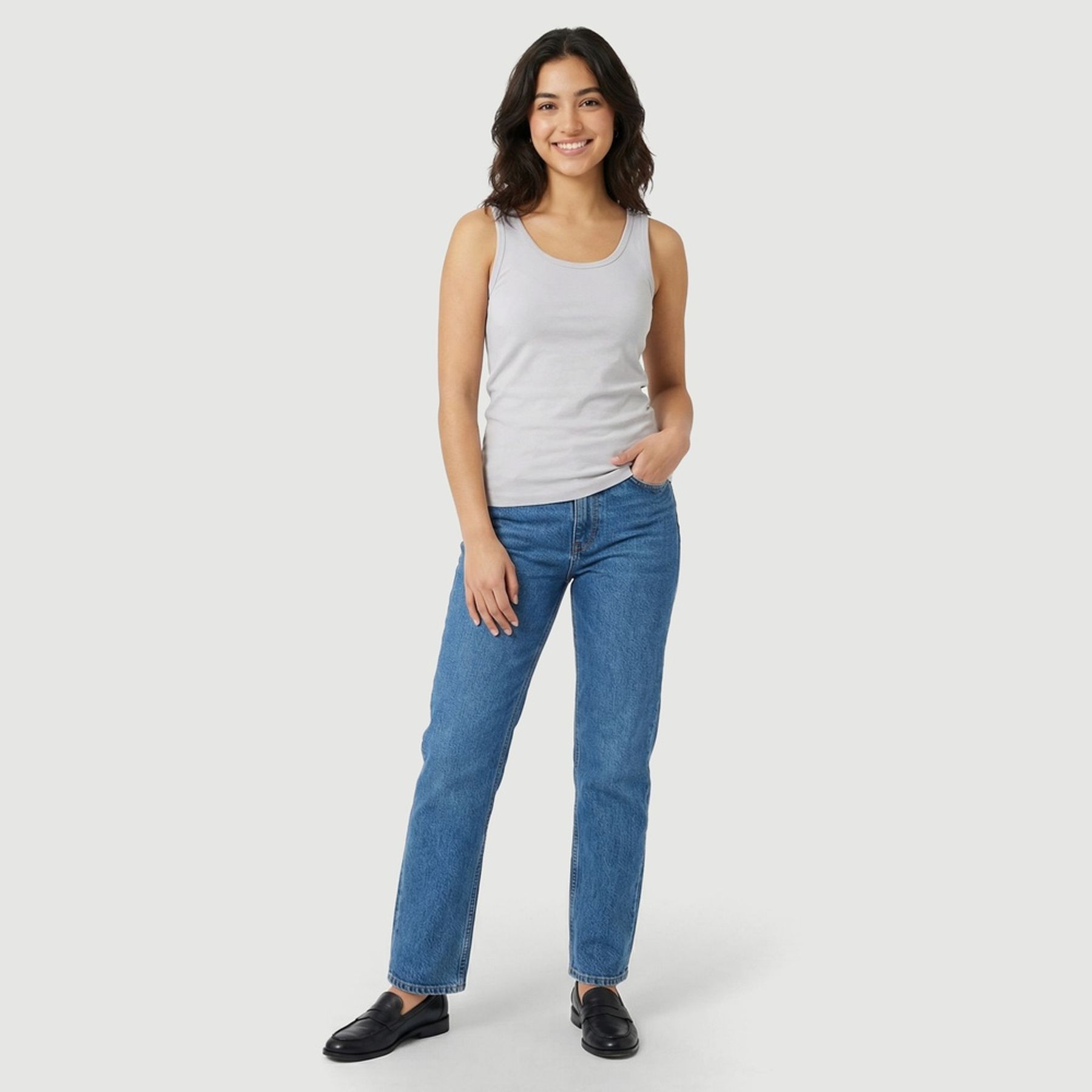 O visual liso em branco, com decote redondo, alças largas e barra reta com costura aparente, facilita o uso em diferentes produções, do jeans às saias e shorts.