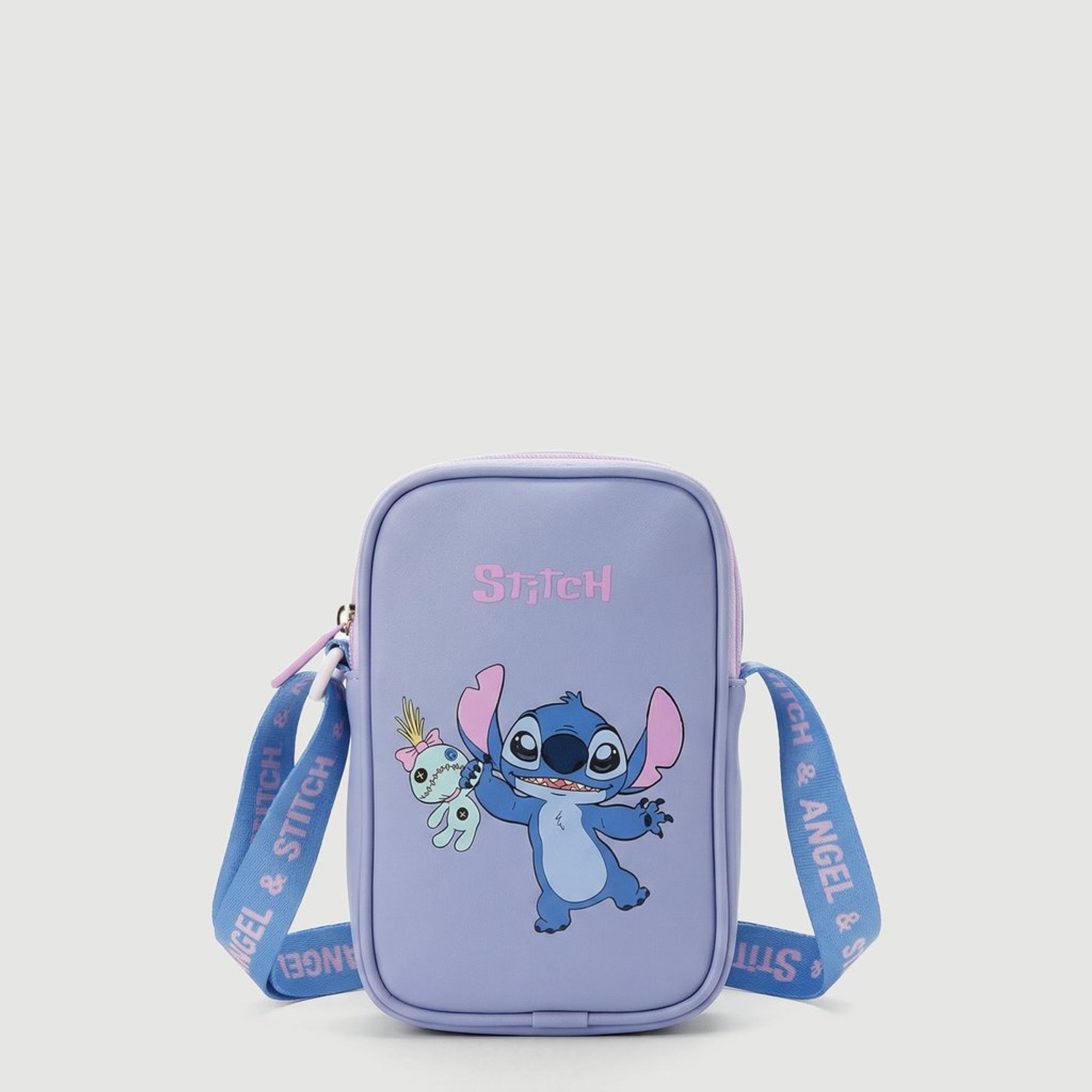 Confeccionada em material sintético emborrachado (100% PVC), conta com alça tiracolo ajustável acetinada e sublimada com a escrita “STITCH & ANGEL”. Em tom de azul com detalhes rosados, é uma opção versátil para passeios e produções casuais.