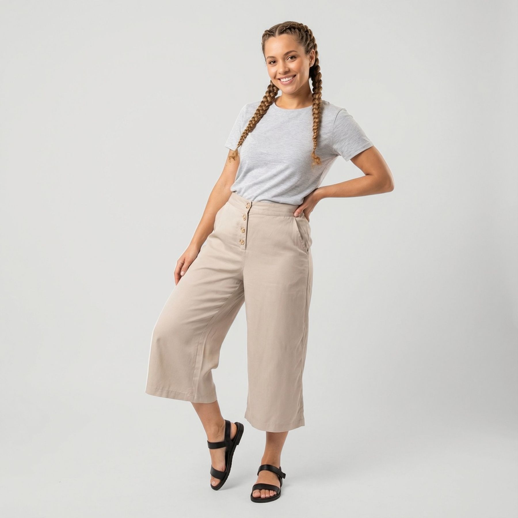 Calça Botão Frontal Pantacourt Liso Cru - Urbano