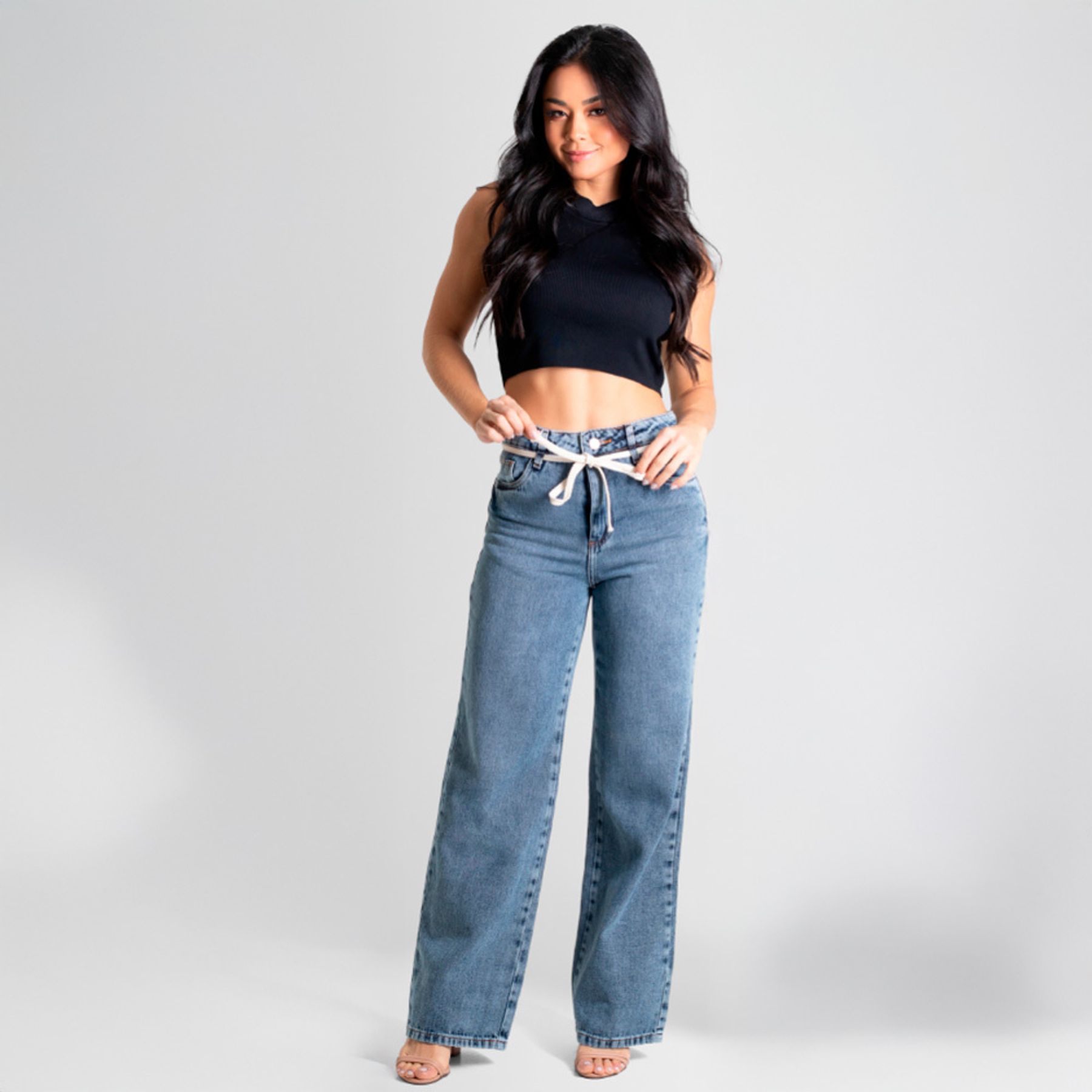 Calça Jeans Feminina Cinto de Amarração Lisa Preta - Biotipo