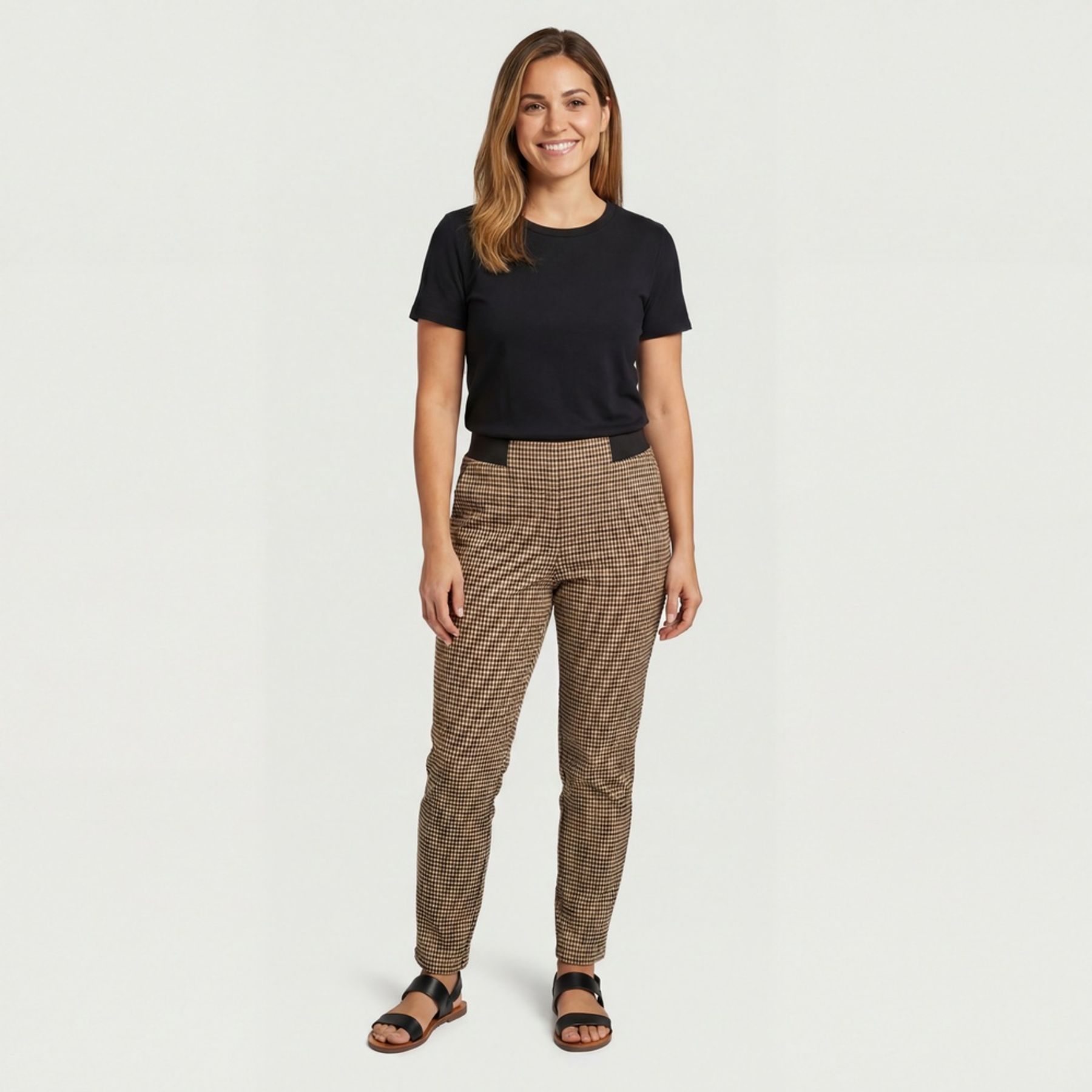 Economia de R$ 30,00Calça feminina Urbano em tecido sintético com estampa xadrez miúdo bege e preto, perfeita para compor produções urbanas com toque social. A modelagem slim e a cintura alta ajudam a criar um visual moderno e alinhado, valorizando a silhueta.