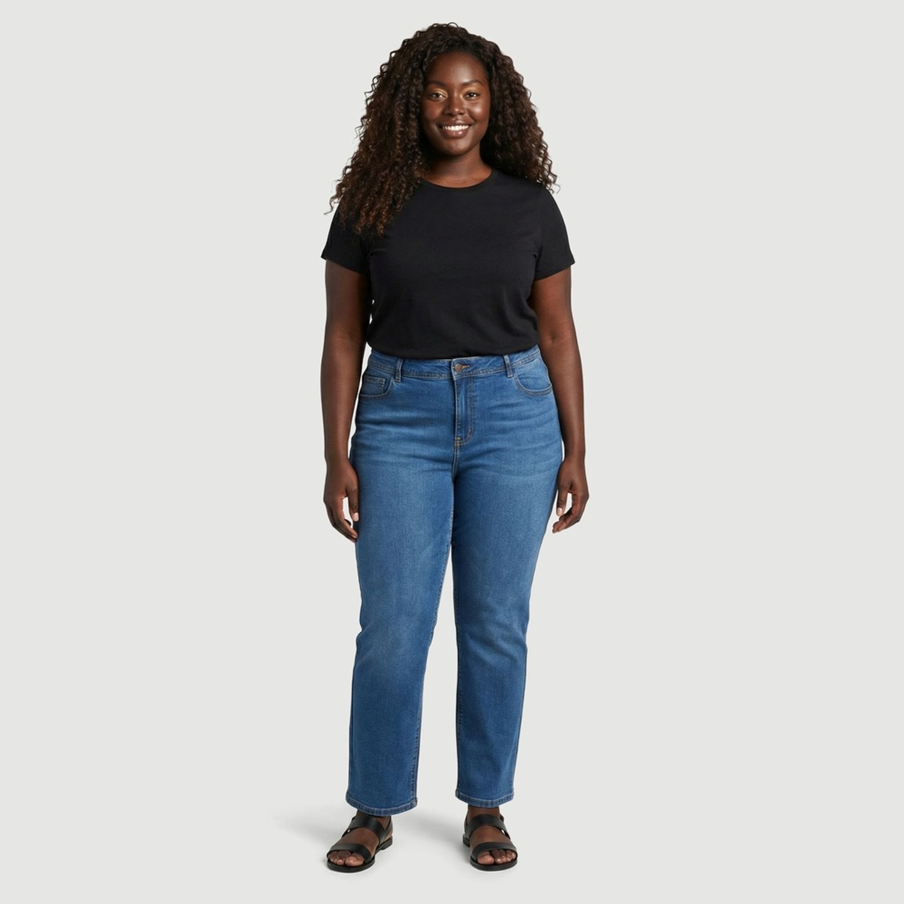A modelagem reta oferece caimento confortável. Possui cós com passantes, fechamento frontal por botão e zíper, além de bolsos frontais com bolso relógio e costuras aparentes, reforçando o estilo tradicional do jeans.