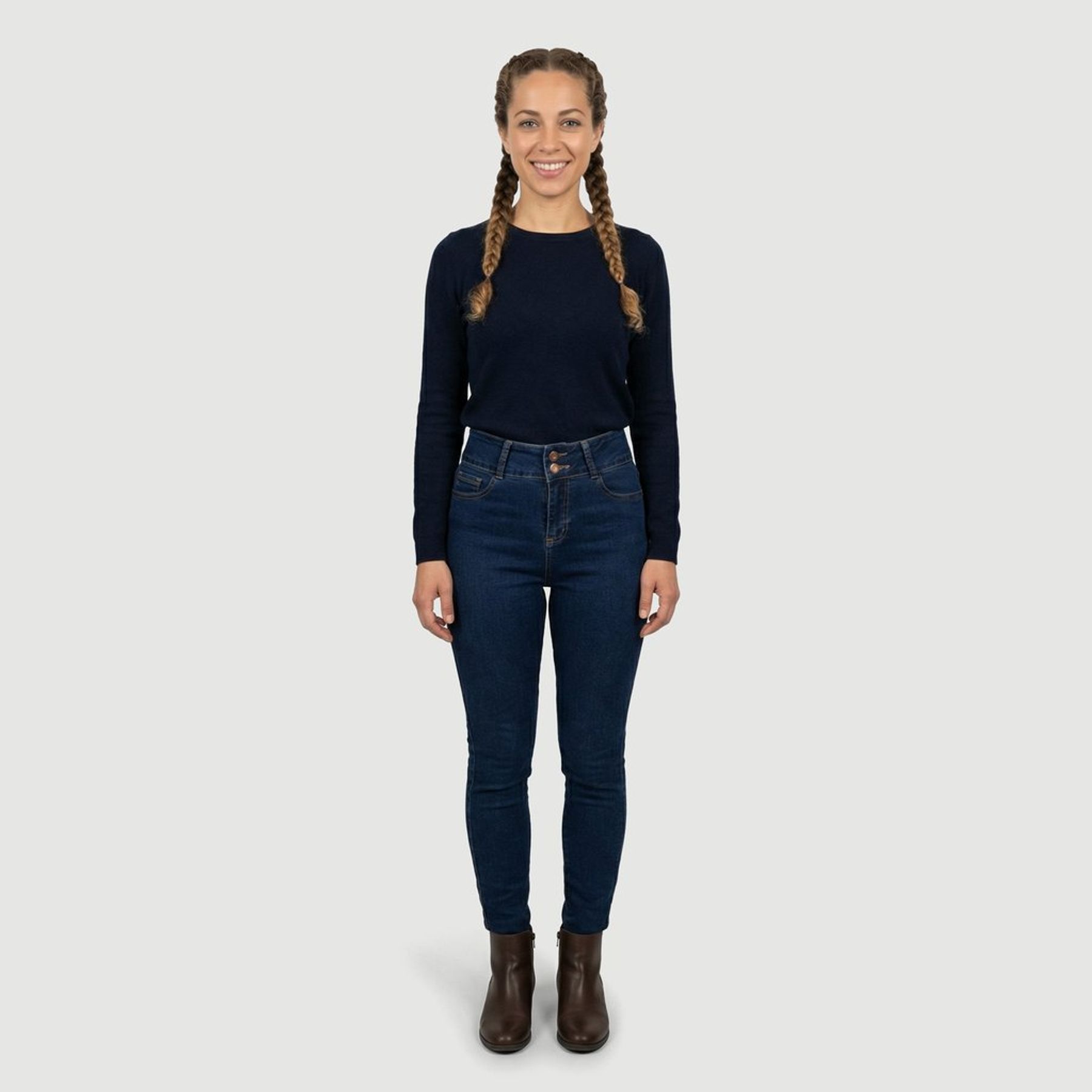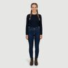 Economia de R$ 9,00A calça jeans feminina Ink tem modelagem skinny e cós alto, com visual clean em jeans liso azul-marinho escuro, sem lavagens marcadas. Possui fechamento frontal com 2 botões, passantes para cinto, bolsos frontais, bolso falso e acabamento sem rebites, além de costuras aparentes em tom contrastante e barra simples. Confeccionada em tecido misto com predominância de algodão, é uma peça versátil para combinar com diferentes produções.