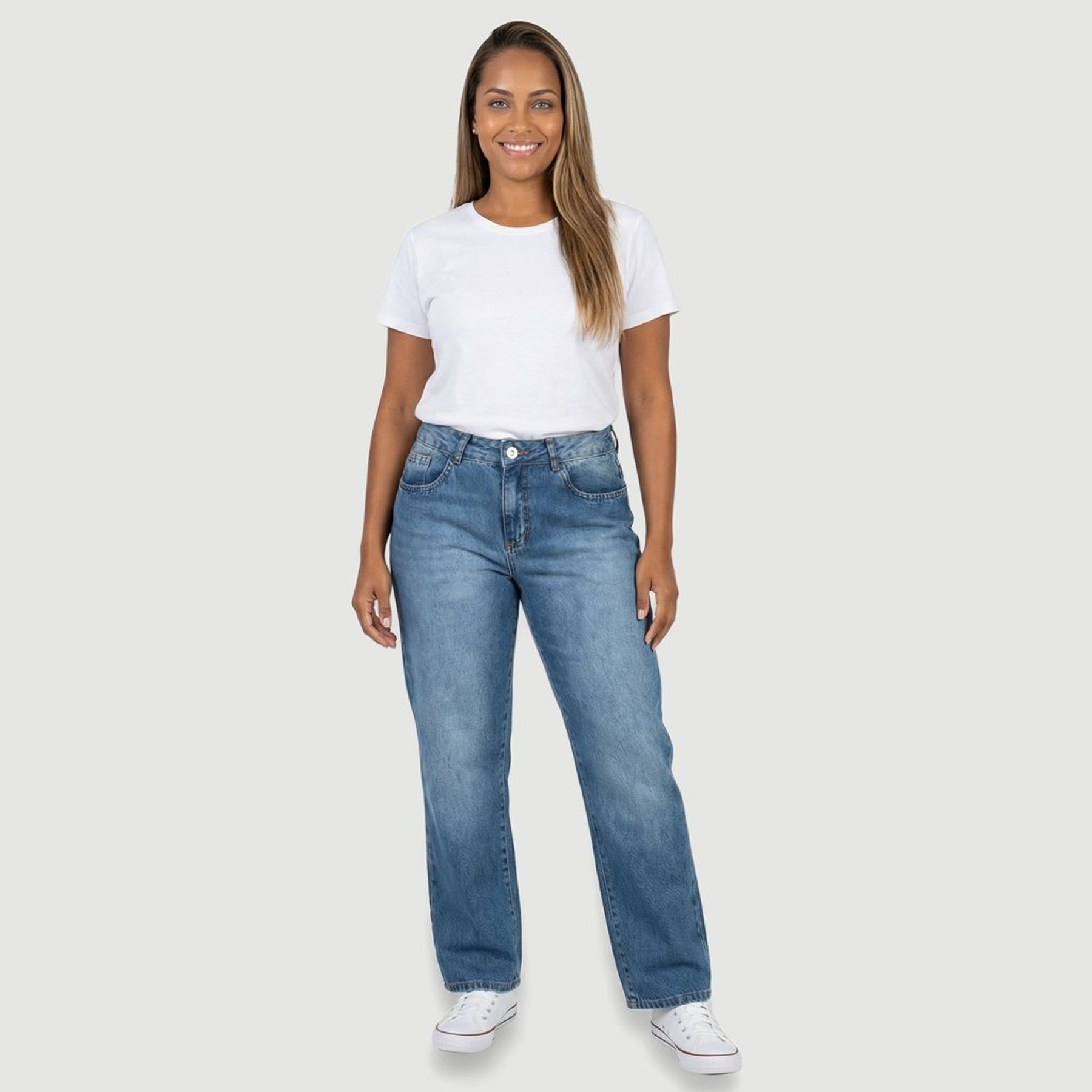 A modelagem boot cut tem pernas levemente abertas na barra, valorizando o caimento e facilitando combinações com vários tipos de calçados. O acabamento conta com cós com passantes, fechamento frontal por botão e zíper, bolsos frontais e costuras aparentes, com lavagem clara e áreas mais escuras nas laterais e na cintura.