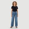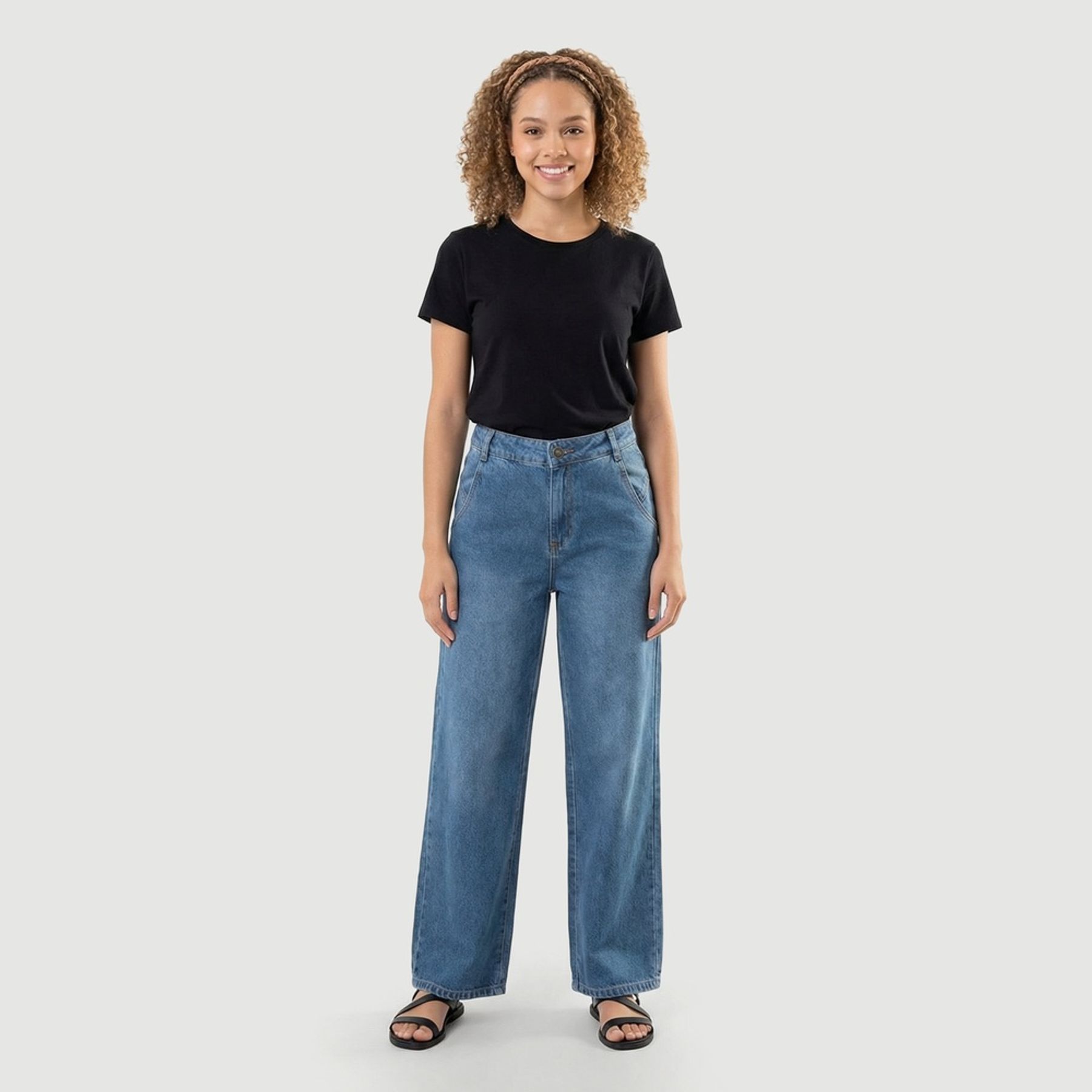 Conta com cintura alta, fechamento frontal por botão e braguilha com zíper. A modelagem de perna reta e ampla (wide leg) garante caimento moderno e liberdade de movimento. O design em jeans azul médio liso traz leve efeito desbotado uniforme, bolsos frontais grandes estilo faca, recortes no quadril com pala sobreposta, costuras aparentes e barra simples.