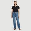 Possui cintura média, fechamento por botão e zíper e passantes para cinto, facilitando diferentes combinações. A modelagem boot cut tem barra levemente aberta com fenda, trazendo um detalhe moderno para produções com camiseta, camisa ou blusa.