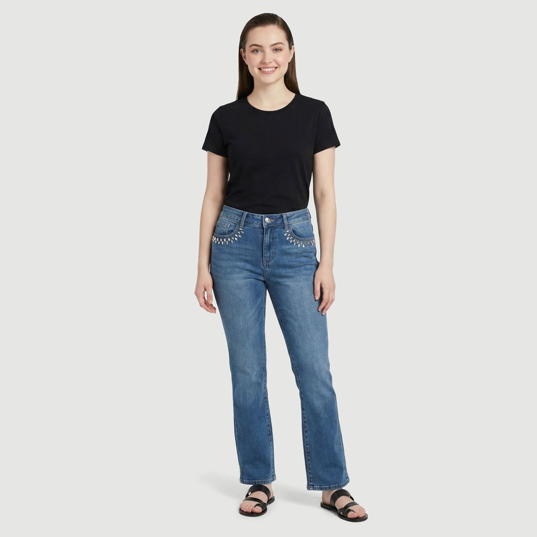 Economia de R$ 19,00A calça jeans feminina Sawary une visual versátil e toque sofisticado com aplicações de pedrarias na entrada dos bolsos frontais. Confeccionada em material misto com predominância de algodão, oferece conforto e bom caimento.