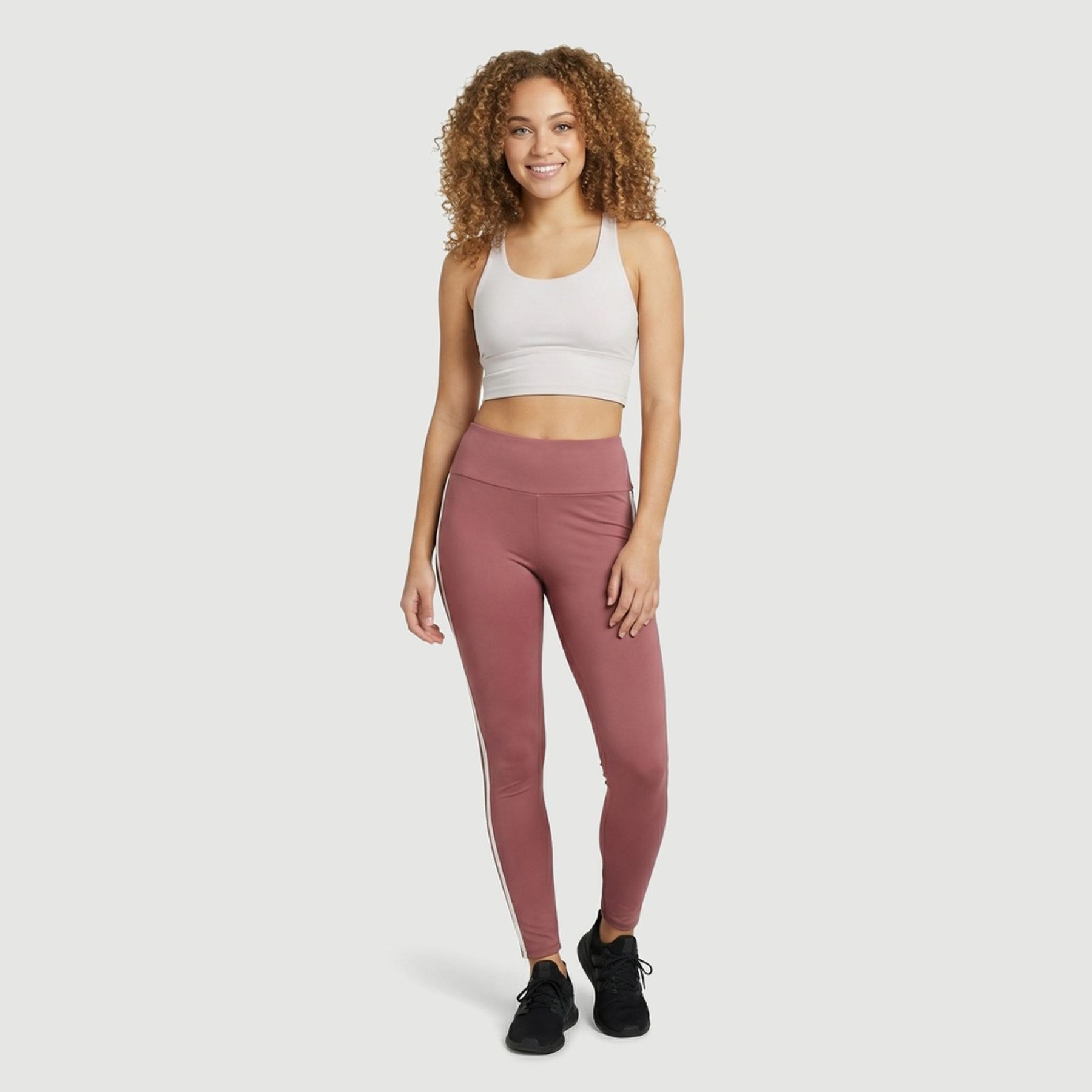 A modelagem legging com cintura alta e cós largo ajuda a firmar na cintura com mais segurança. A faixa lateral contrastante em branco cria um efeito alongador e valoriza a silhueta. Visual liso na cor rosa e sem bolsos aparentes.