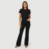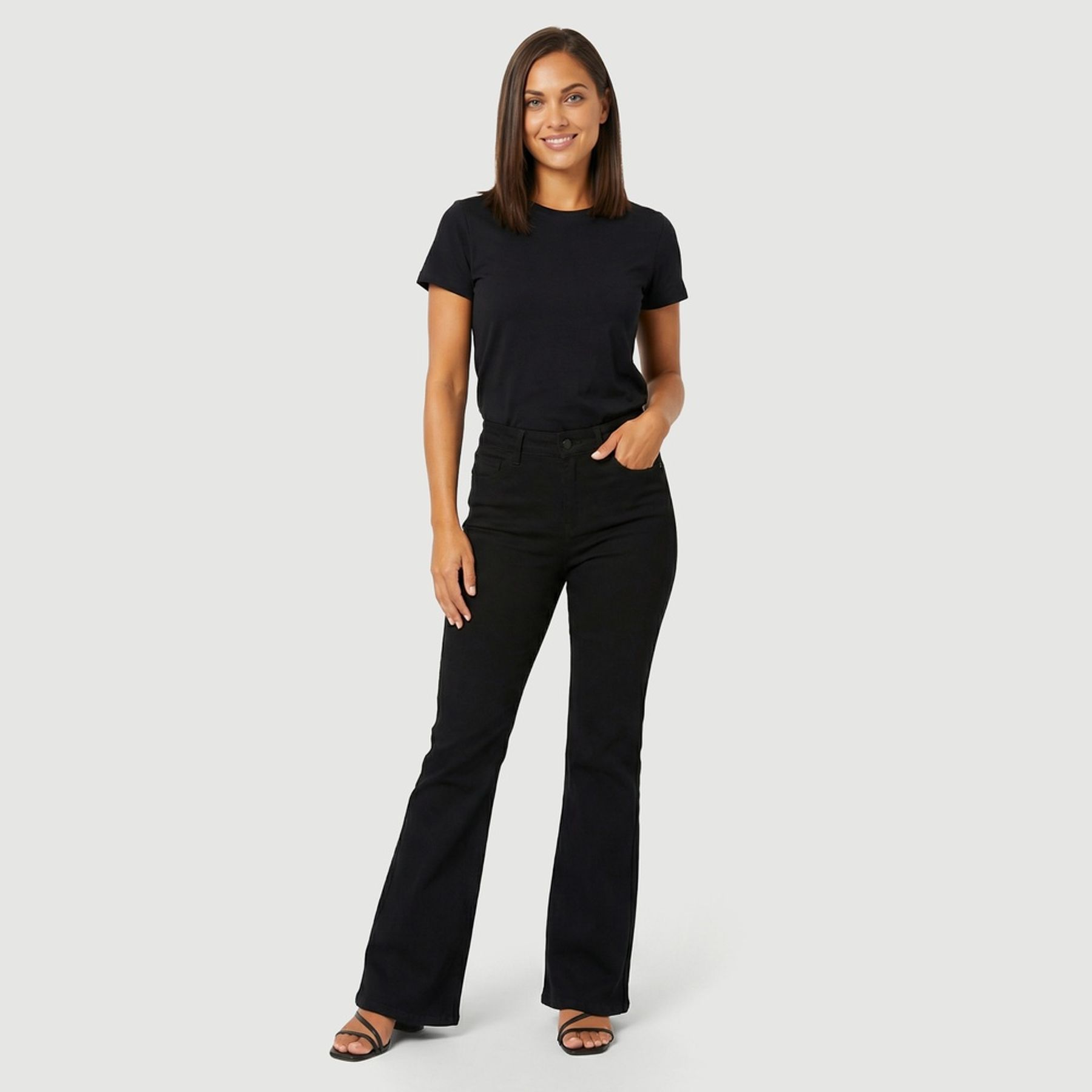 A modelagem flare com boca mais ampla ajuda a equilibrar a silhueta, enquanto a cintura média oferece um ajuste prático para diferentes ocasiões. O fechamento frontal com botão, o recorte tipo braguilha e o cós com passantes finalizam o visual e permitem o uso com cinto.