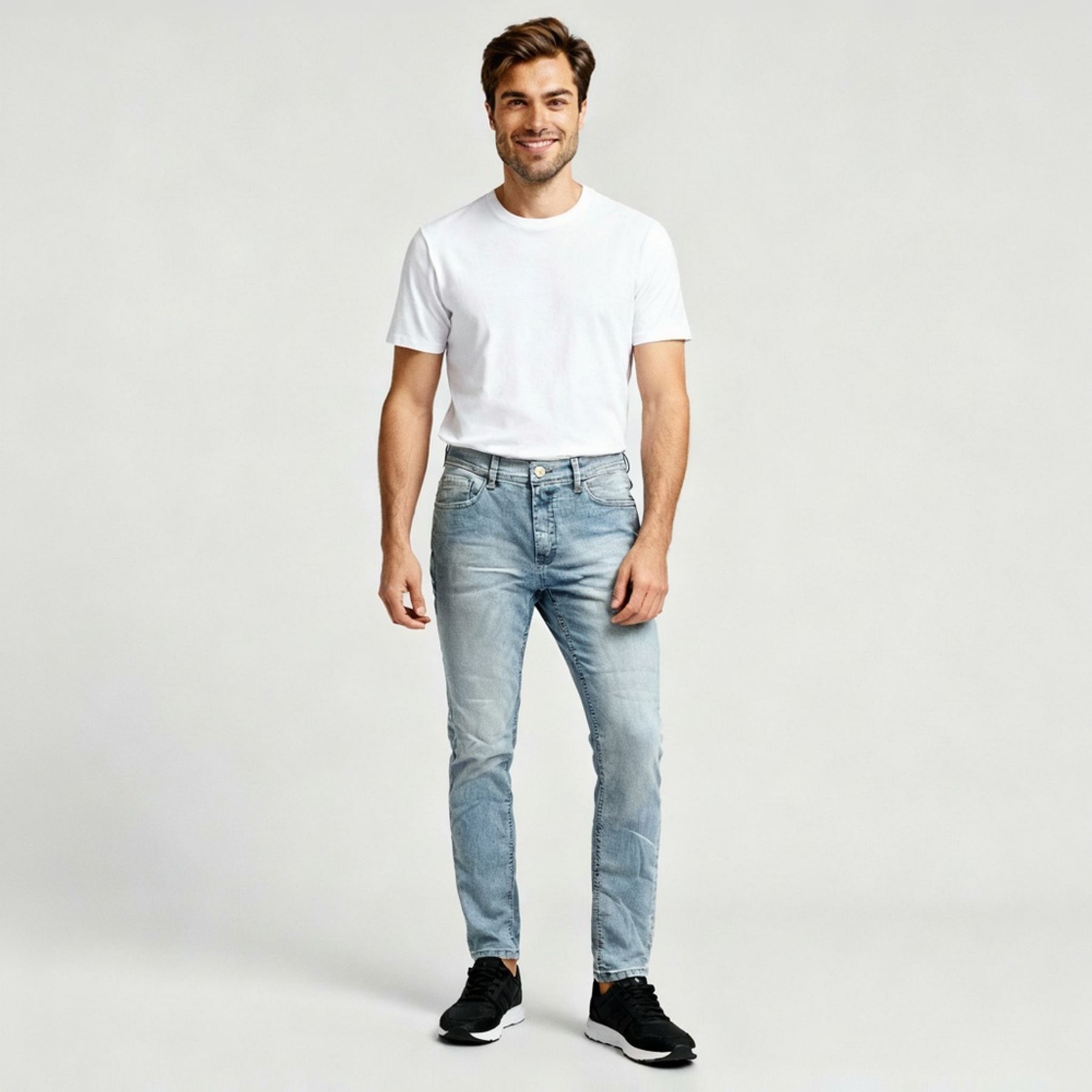 Economia de R$ 49,00A calça jeans masculina skinny oferece um visual moderno e descomplicado, valorizando o estilo urbano do homem contemporâneo. Confeccionada em tecido plano misto de algodão, poliéster e elastano, proporciona mobilidade no uso e caimento ajustado ao corpo. O tom azul claro liso amplia as possibilidades de combinação, sendo prática e versátil para diferentes situações. Os detalhes clássicos de botões e bolsos frontais reforçam a funcionalidade da peça, unindo design atual ao conforto que o jeans proporciona.