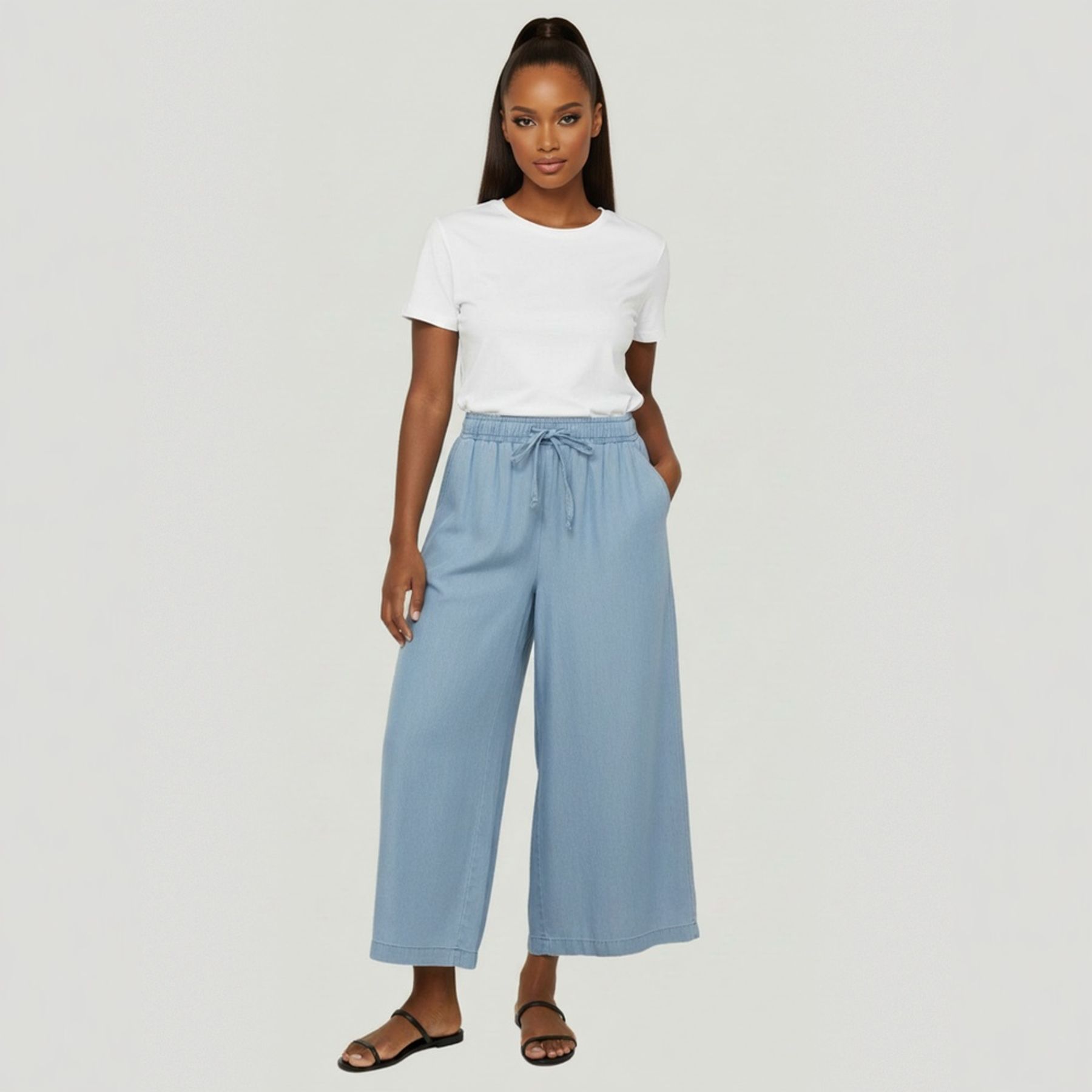 Economia de R$ 41,00Calça feminina pantalona confeccionada em jeans 100% algodão, com elástico no cós traseiro e cordão ajustável, proporcionando ajuste e praticidade ao vestir. O modelo liso em tom azul oferece versatilidade para diversas combinações, tornando-se uma ótima opção para produções descomplicadas.