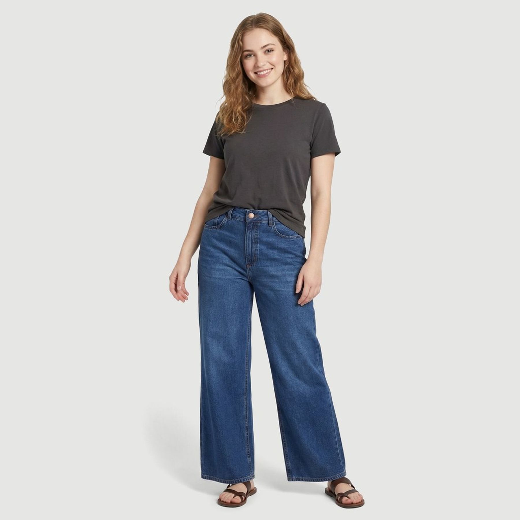 Economia de R$ 14,00Calça jeans feminina wide leg, confeccionada em denim de alta qualidade no tom azul escuro. Possui lavagem super stone used com efeito bigode, que agrega estilo moderno e autêntico. O modelo de perna ampla garante conforto e elegância, enquanto o acabamento liso torna a peça versátil para diferentes combinações.
