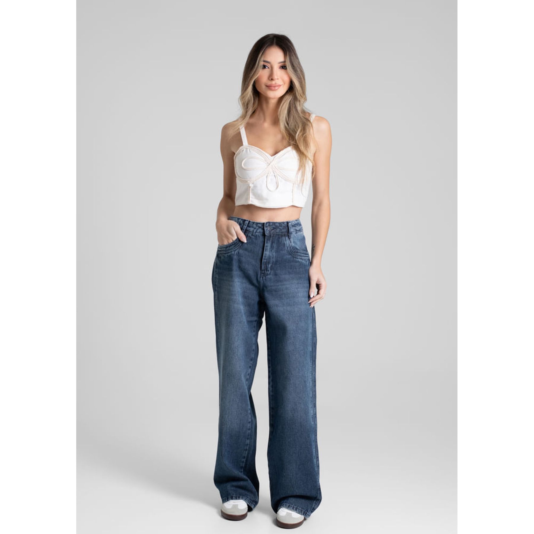 Calça Jeans Feminina Wide Leg Slim Brilhos Azul - Ink