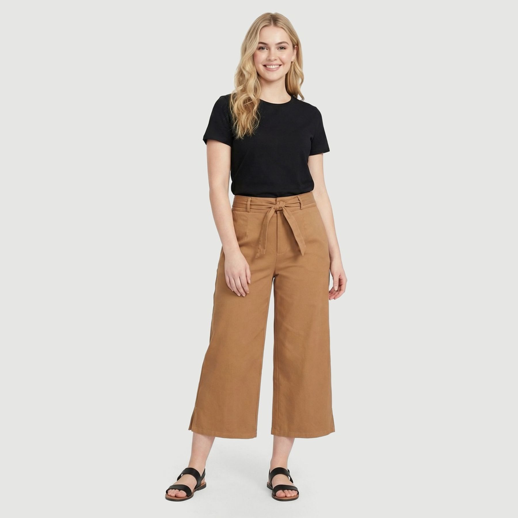 Com caimento solto e barra ampla, o modelo traz fendas laterais discretas que adicionam movimento ao visual. A cintura alta tem cós com passantes e amarração para ajuste, proporcionando melhor vestibilidade e um acabamento alinhado.