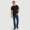 A lavagem azul escuro com leve efeito stone used facilita combinações com camiseta, camisa ou jaqueta. O design segue o estilo clássico de cinco bolsos, com cós com passantes e fechamento frontal por botão e zíper.