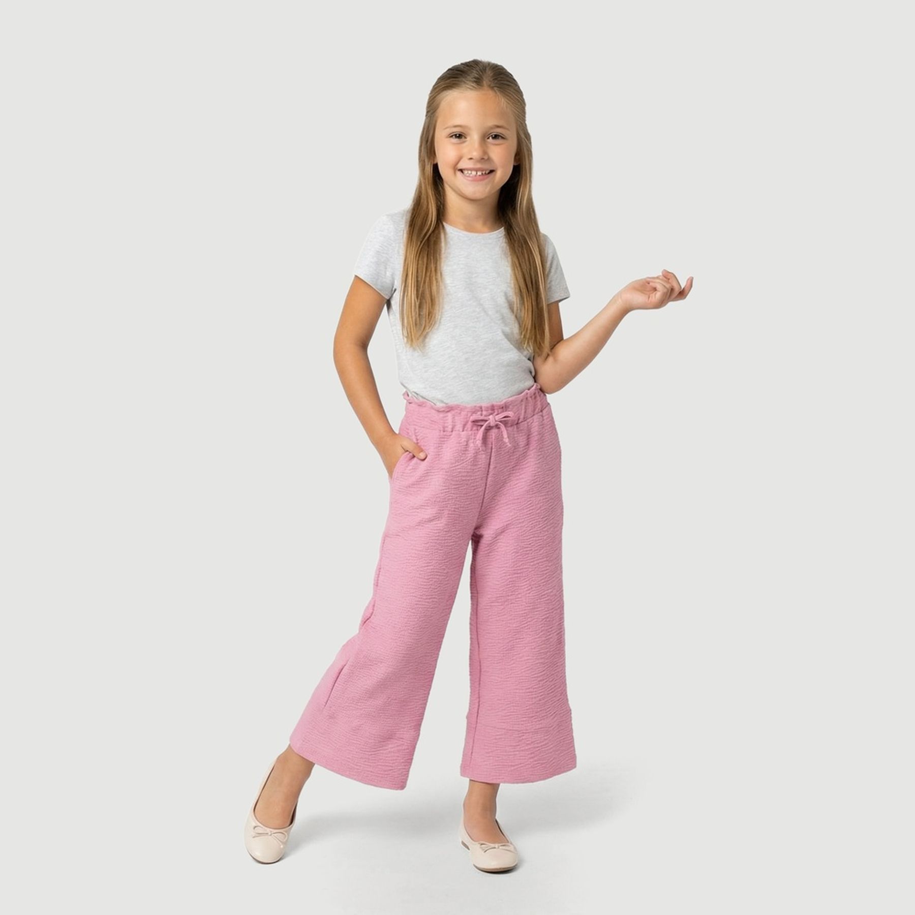 A modelagem ampla favorece a liberdade de movimento, enquanto o cós com elástico facilita o vestir e melhora o ajuste. Na cor pink, é ideal para passeios, escola e momentos de lazer, com composição mista com predominância de poliéster.