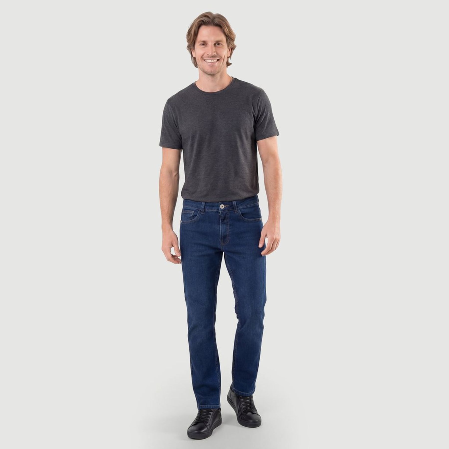 Economia de R$ 11,00A calça jeans masculina Ink é ideal para compor produções básicas e versáteis. Em jeans azul escuro liso, traz modelagem reta e acabamento clássico, combinando com camiseta, camisa ou jaqueta.