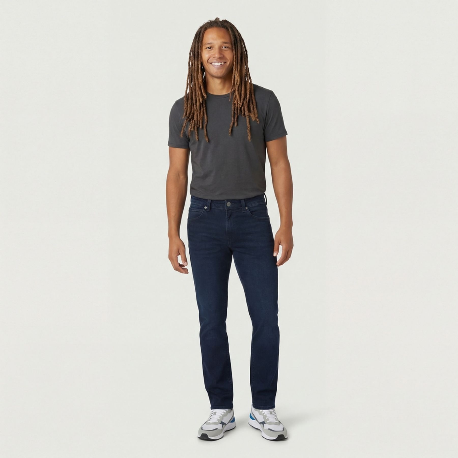 Em azul marinho com lavagem escura uniforme e visual liso, tem modelagem reta/ajustada e construção tradicional de 5 bolsos. Os acabamentos incluem cós com passantes, fechamento por botão, braguilha com zíper, rebites metálicos e costuras aparentes.