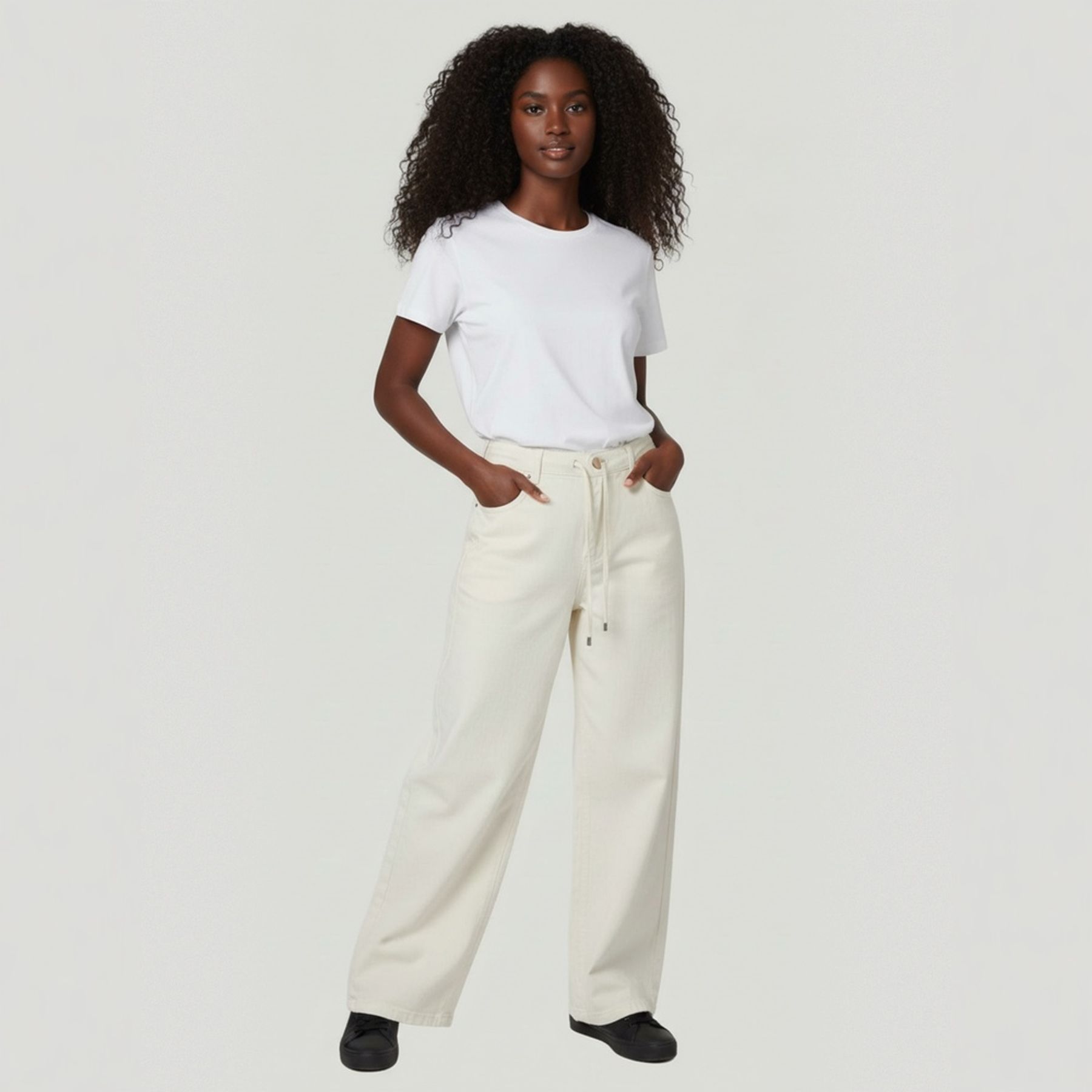 Economia de R$ 68,00A calça sarja feminina modelo wide relaxed apresenta um visual descontraído, ideal para quem busca estilo com praticidade. Produzida em tecido plano de algodão, proporciona toque confortável e é perfeita para compor diferentes looks modernos. Seu tom creme liso e os detalhes de cordão nas ponteiras adicionam charme ao design.
