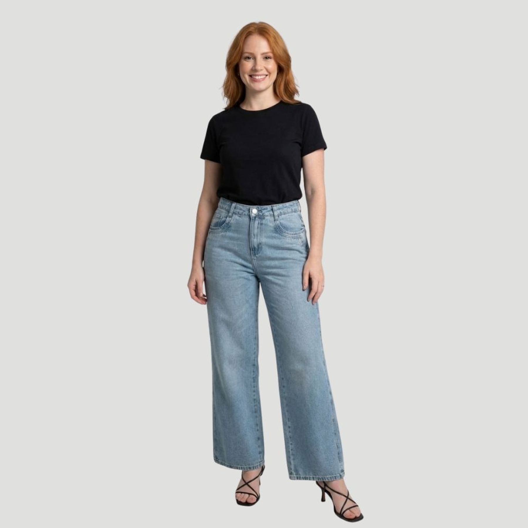 Economia de R$ 53,00A Calça Jeans Feminina Wide Leg Sawary combina caimento amplo e visual moderno para compor produções versáteis. Confeccionada em tecido misto com predominância de algodão, possui lavagem clara e acabamento liso. O modelo conta com cintura média/alta, passantes para cinto e bolsos traseiros, além de recortes laterais que valorizam o design.