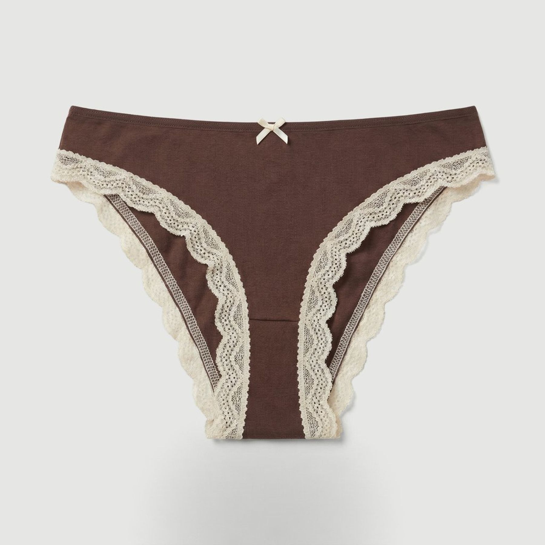 Economia de R$ 2,00Calcinha feminina Uniq em malha de viscose, com toque macio e caimento confortável. O modelo tanga/asa delta tem visual liso na cor marrom e recebe detalhe em renda nas laterais e no contorno das pernas, além de lacinho frontal no cós para um acabamento delicado.