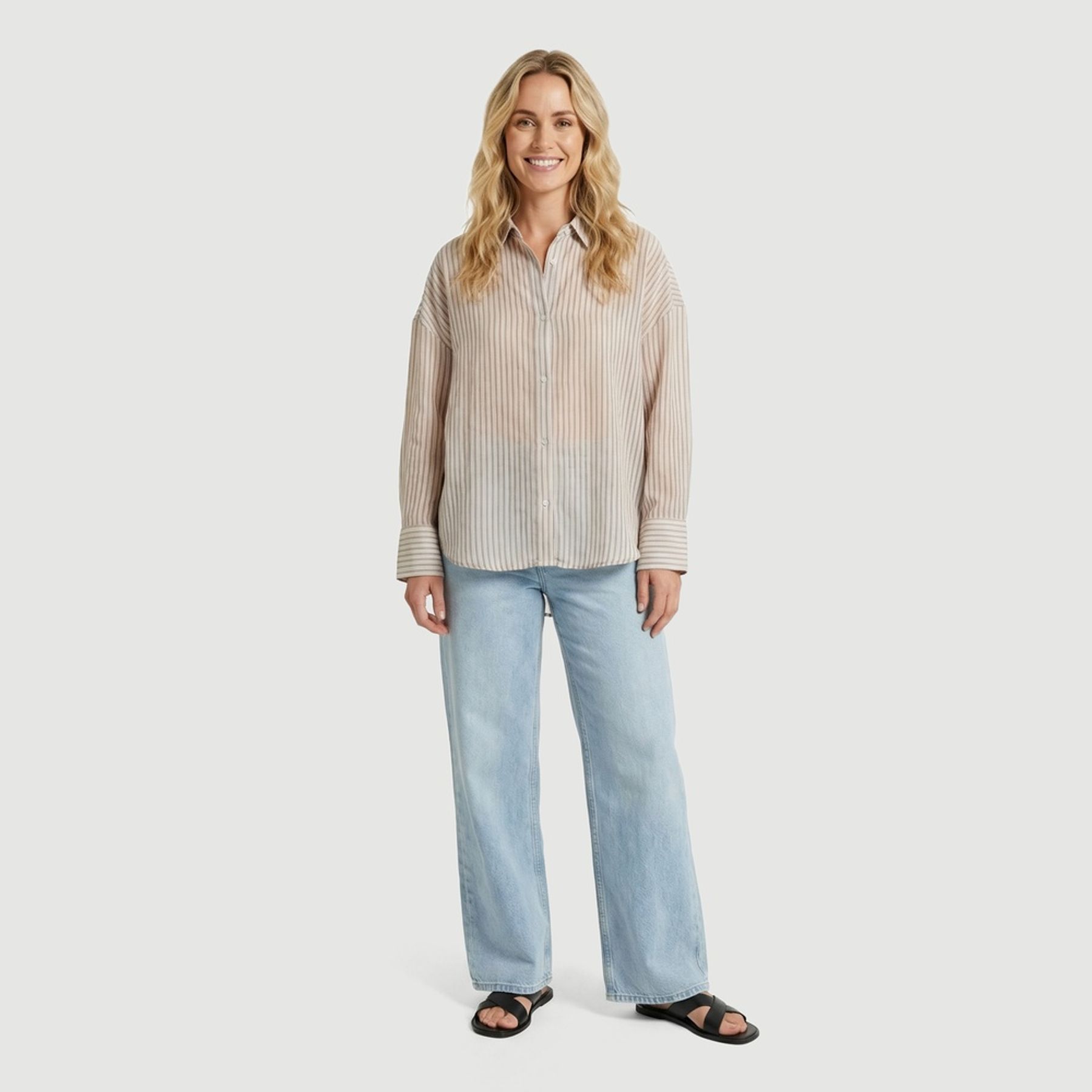 Economia de R$ 30,00A camisa feminina de manga longa Urbano é uma opção versátil para compor produções sociais ou casuais com visual clássico. Confeccionada em tecido sintético leve, com composição mista e predominância de poliéster, possui listras verticais finas em bege e branco, que ajudam a alongar a silhueta e facilitam combinações.