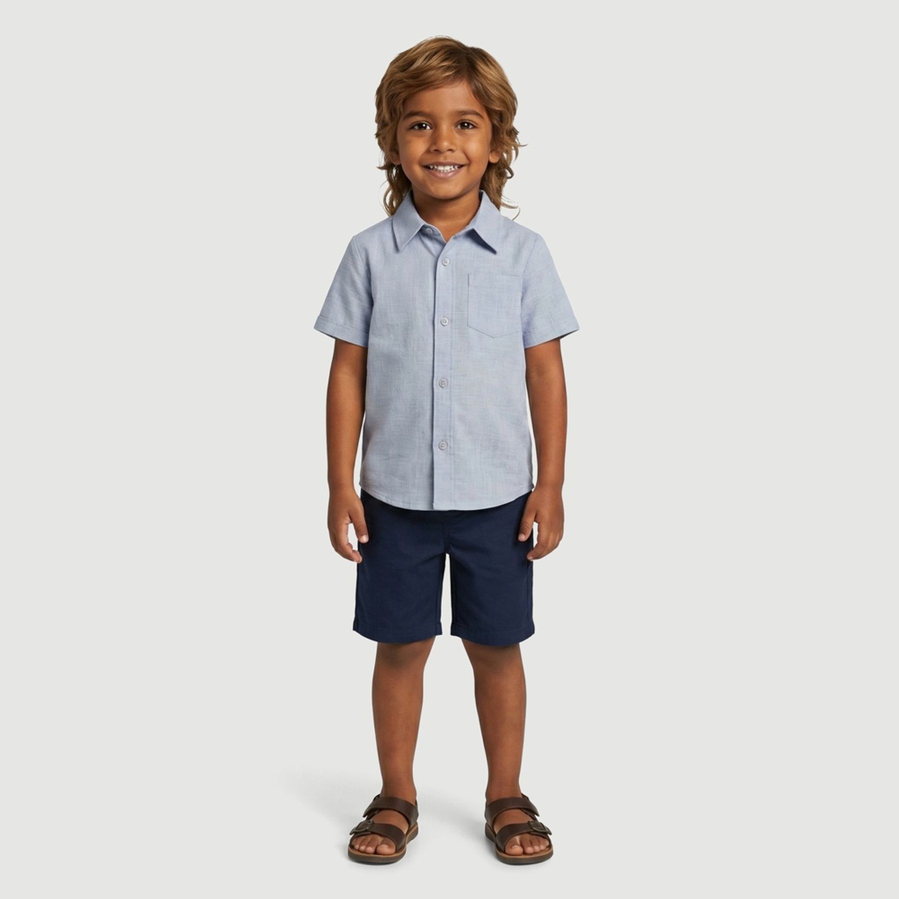Economia de R$ 8,00Camisa infantil Toys & Kids em tom azul suave, com visual alinhado e fácil de combinar. Confeccionada em tecido misto com predominância de algodão, tem textura discreta tipo slub e toque macio.