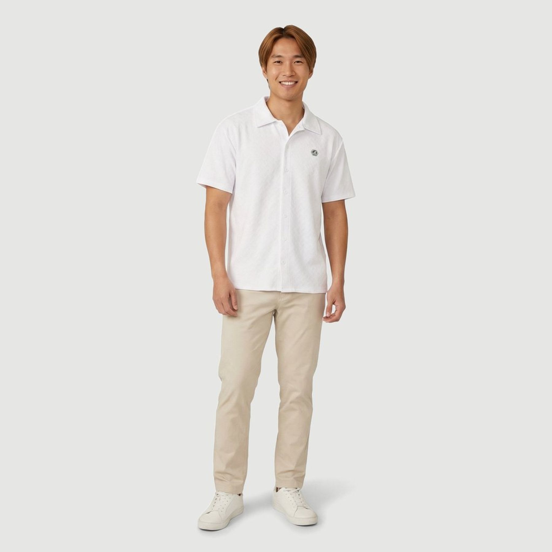 Economia de R$ 10,00A camisa polo masculina branca em malha jacquard traz um visual clean com textura discreta em padrão geométrico. Possui gola polo, abertura frontal por botões, manga curta e barra reta, combinando bem com jeans, sarja ou bermuda. Confeccionada em 100% poliéster, oferece praticidade para a rotina e acabamento com aplicação pequena no peito. Conteúdo da embalagem: 1 camisa. Marca: Pernambucanas Casa.