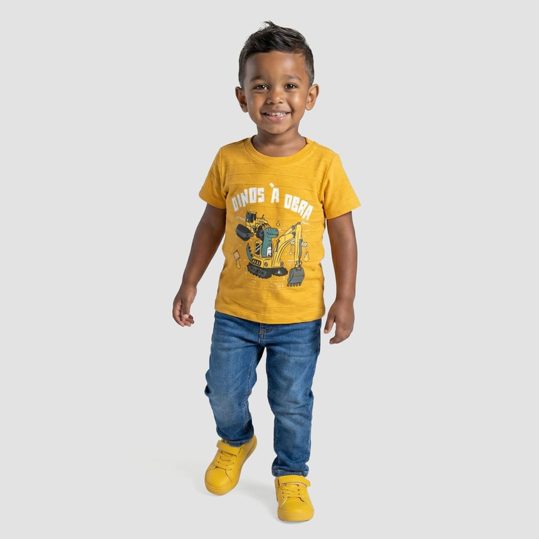 Economia de R$ 3,60A camiseta infantil masculina traz visual divertido com a frase "DINOS À OBRA" e ilustração de dinossauro em clima de construção. Feita em malha com predominância de algodão, oferece toque macio e liberdade para brincar. O modelo tem gola redonda, mangas curtas e textura canelada horizontal que adiciona um diferencial ao look.