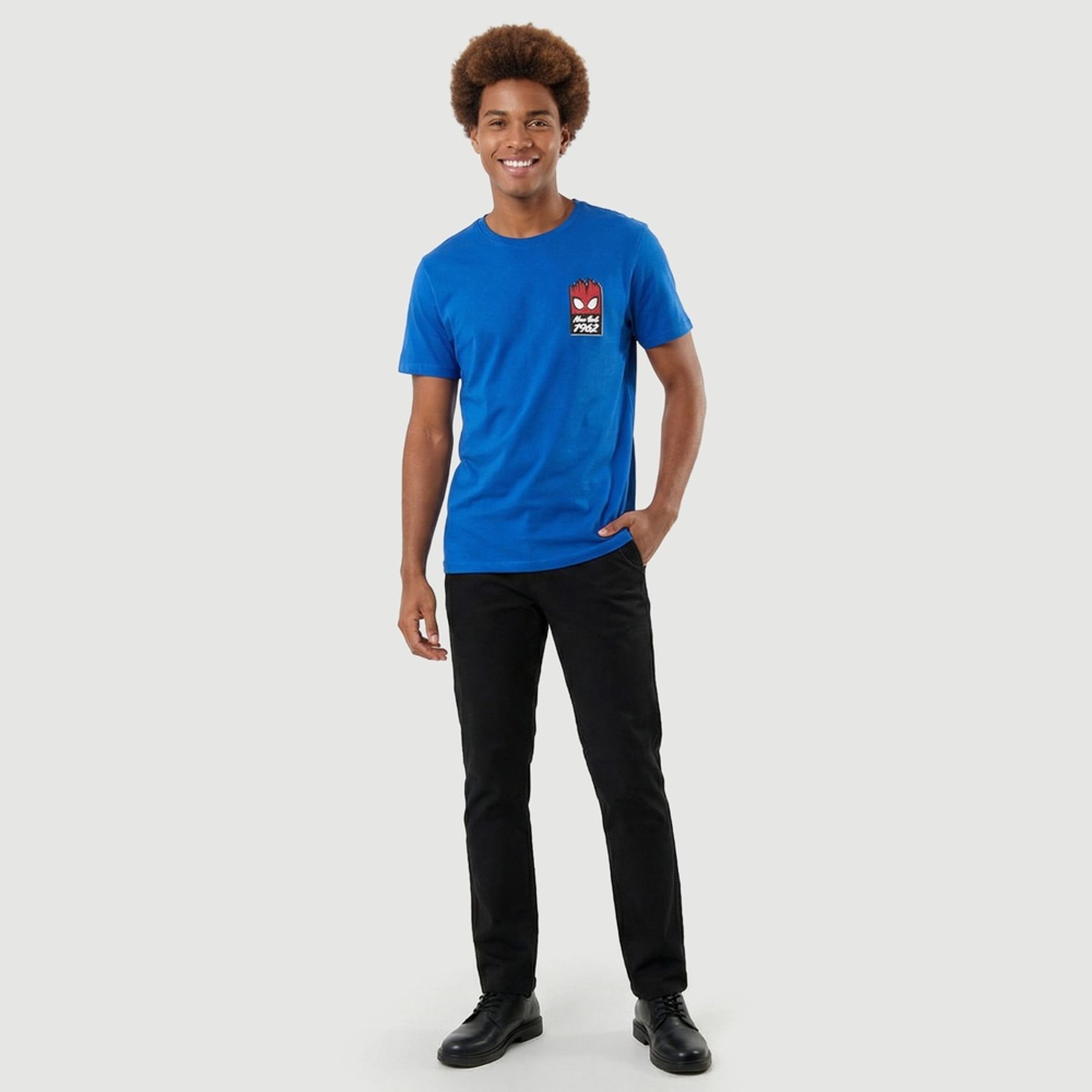 Economia de R$ 9,00Camiseta masculina de manga curta em malha 100% algodão, com toque macio e bom caimento. A peça traz visual azul com detalhe discreto do Homem-Aranha no peito, acompanhado do texto “New York 1962”, ideal para compor produções urbanas com personalidade.