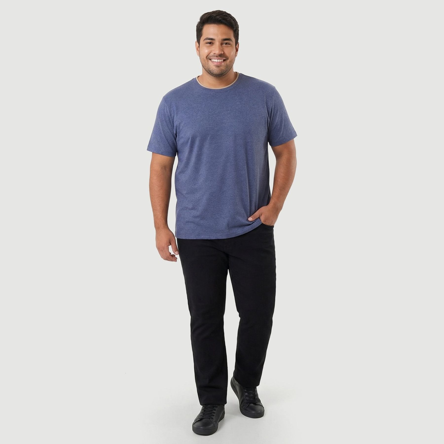 Em azul mescla e visual liso, traz gola redonda com acabamento em retílinea com contraste claro e barra simples, combinando facilmente com jeans e bermudas.