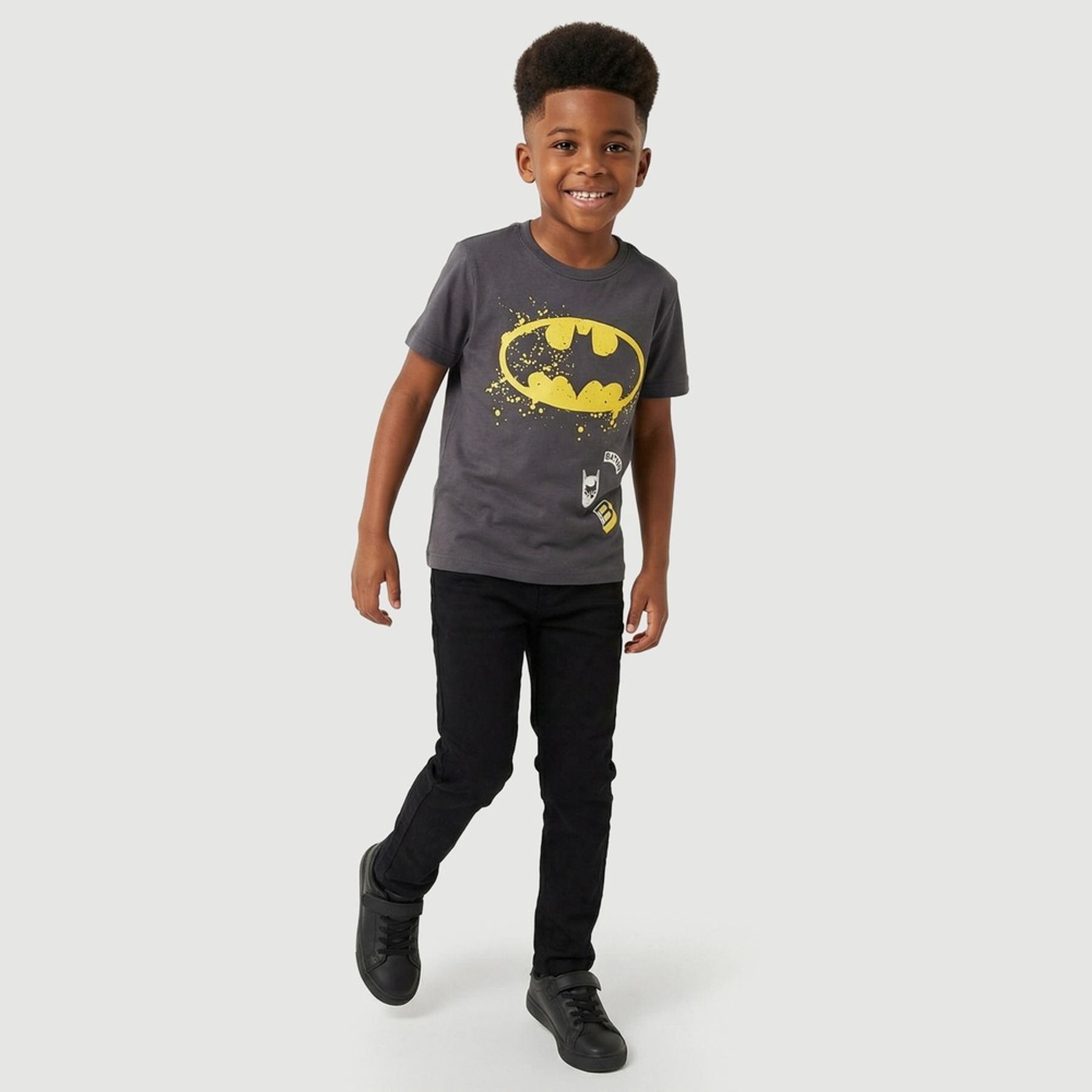 Economia de R$ 3,00Camiseta infantil manga curta em malha de composição mista com predominância de algodão, ideal para acompanhar a rotina com conforto. Possui gola redonda, barra simples e estampa frontal centralizada do Batman, com logo grande em amarelo e detalhes em estilo patch/adesivo, trazendo um visual urbano.