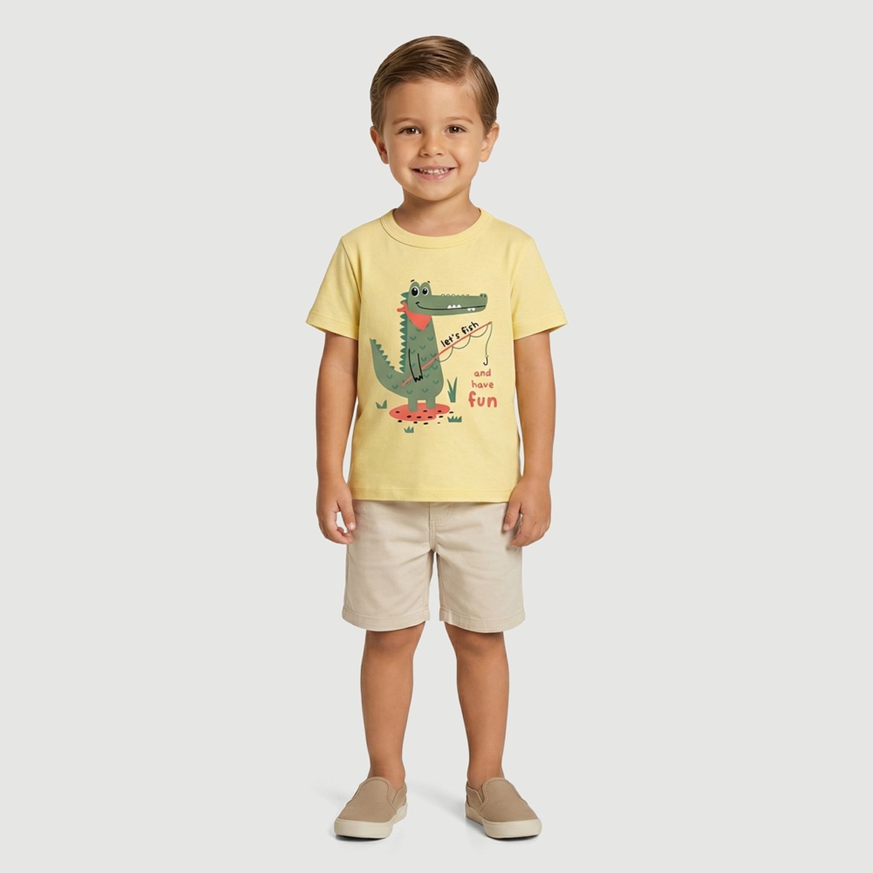 O destaque fica por conta da estampa frontal centralizada de crocodilo cartoon pescando, com a frase "let's fish and have fun", trazendo um visual lúdico e divertido. Em tom amarelo claro com detalhes em verde, é uma ótima opção para compor looks descontraídos.