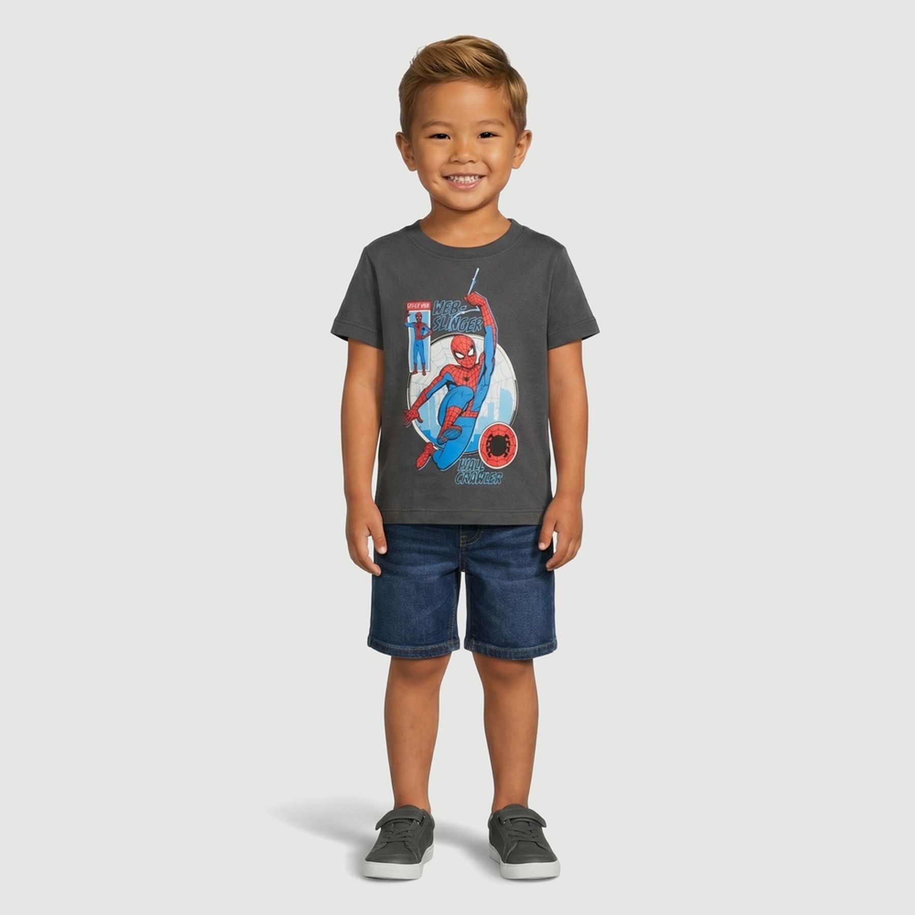 A peça tem manga curta, gola redonda e barra simples. O destaque fica para a estampa frontal centralizada do Spider-Man (Homem-Aranha), com arte em estilo HQ, elementos de teia e textos em evidência.