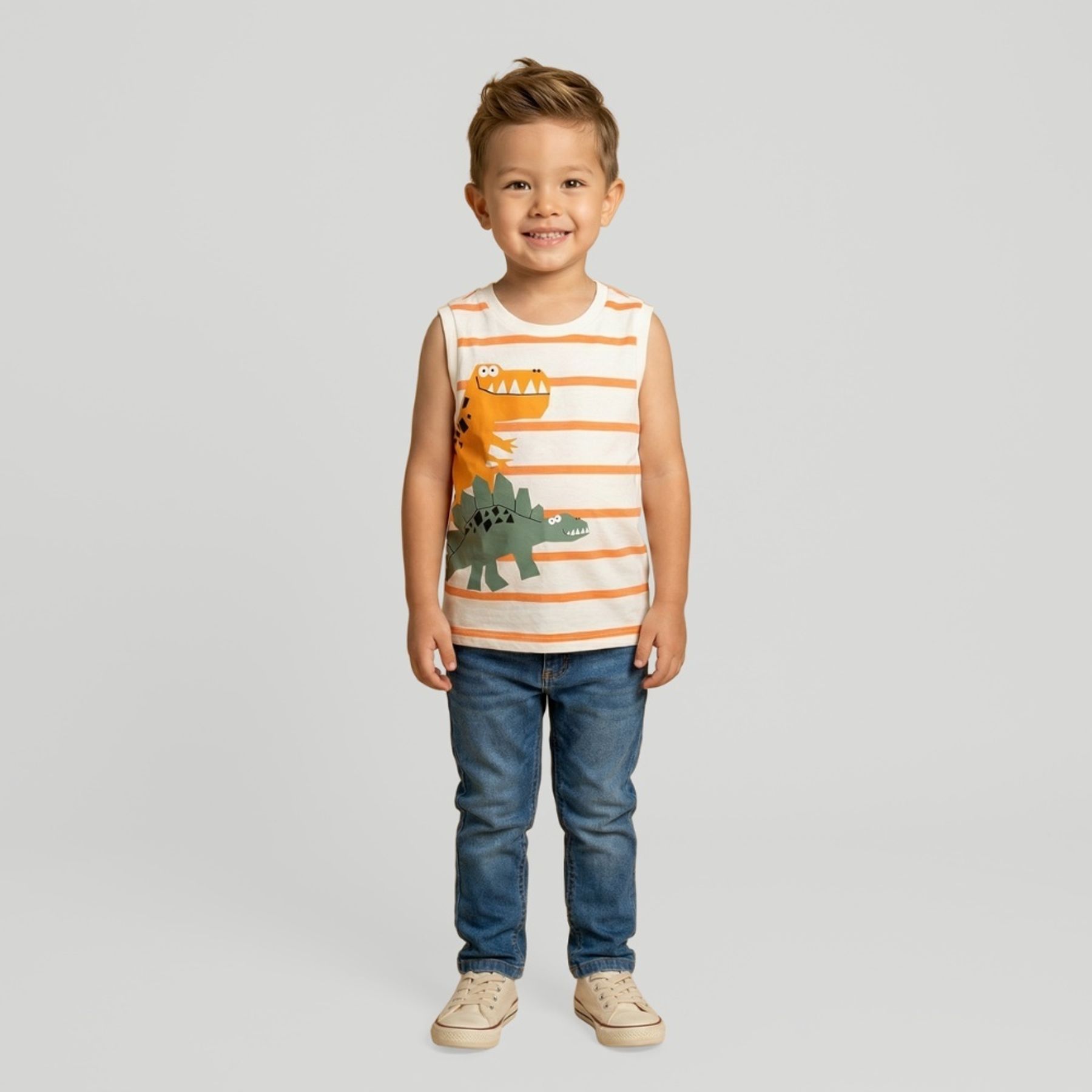 Economia de R$ 8,00A camiseta sem manga masculina é uma opção prática para os dias quentes. Em malha com predominância de algodão, tem toque macio e boa respirabilidade. O visual traz fundo branco com listras horizontais laranja e estampa frontal de dinossauros, ideal para acompanhar as brincadeiras com conforto.