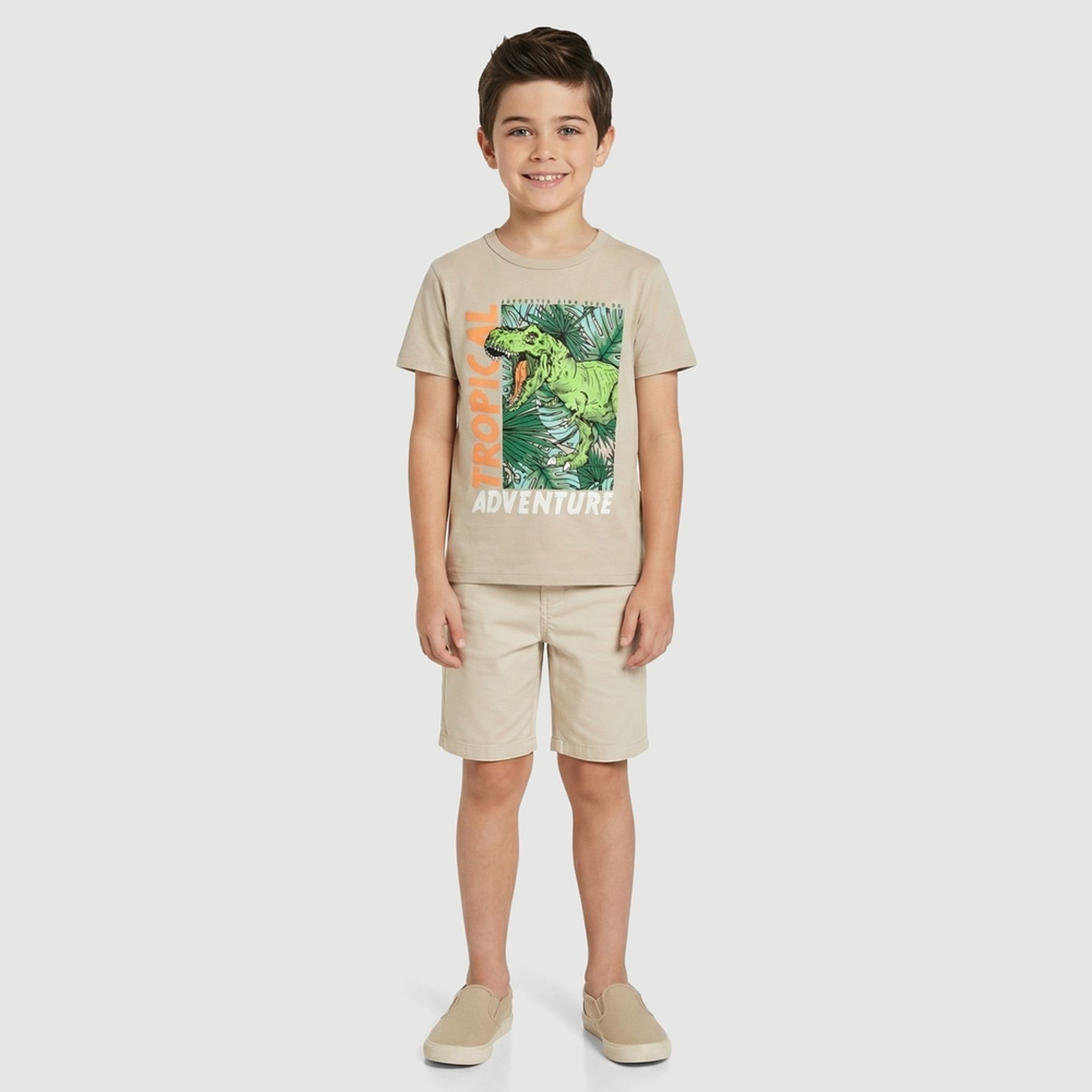 O destaque fica por conta da estampa frontal centralizada com dinossauro e folhagens tropicais, acompanhada dos dizeres “TROPICAL” e “ADVENTURE”, em cores vibrantes sobre o fundo bege.