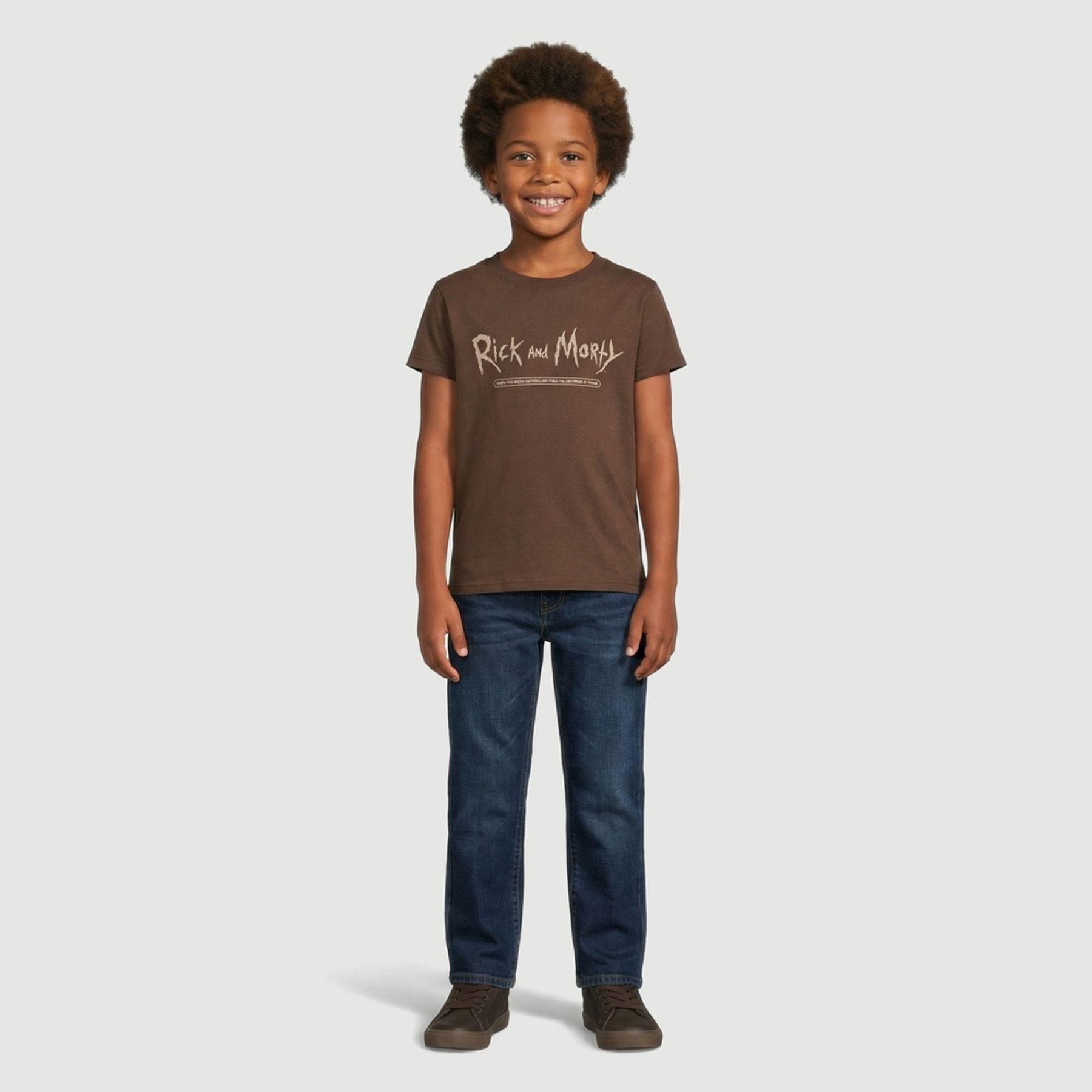 Na cor marrom, traz estampa frontal centralizada com o logotipo “Rick and Morty” em tom claro e uma frase pequena abaixo, criando contraste discreto. O modelo tem manga curta, gola redonda e barra simples, combinando bem com jeans, bermudas e tênis.