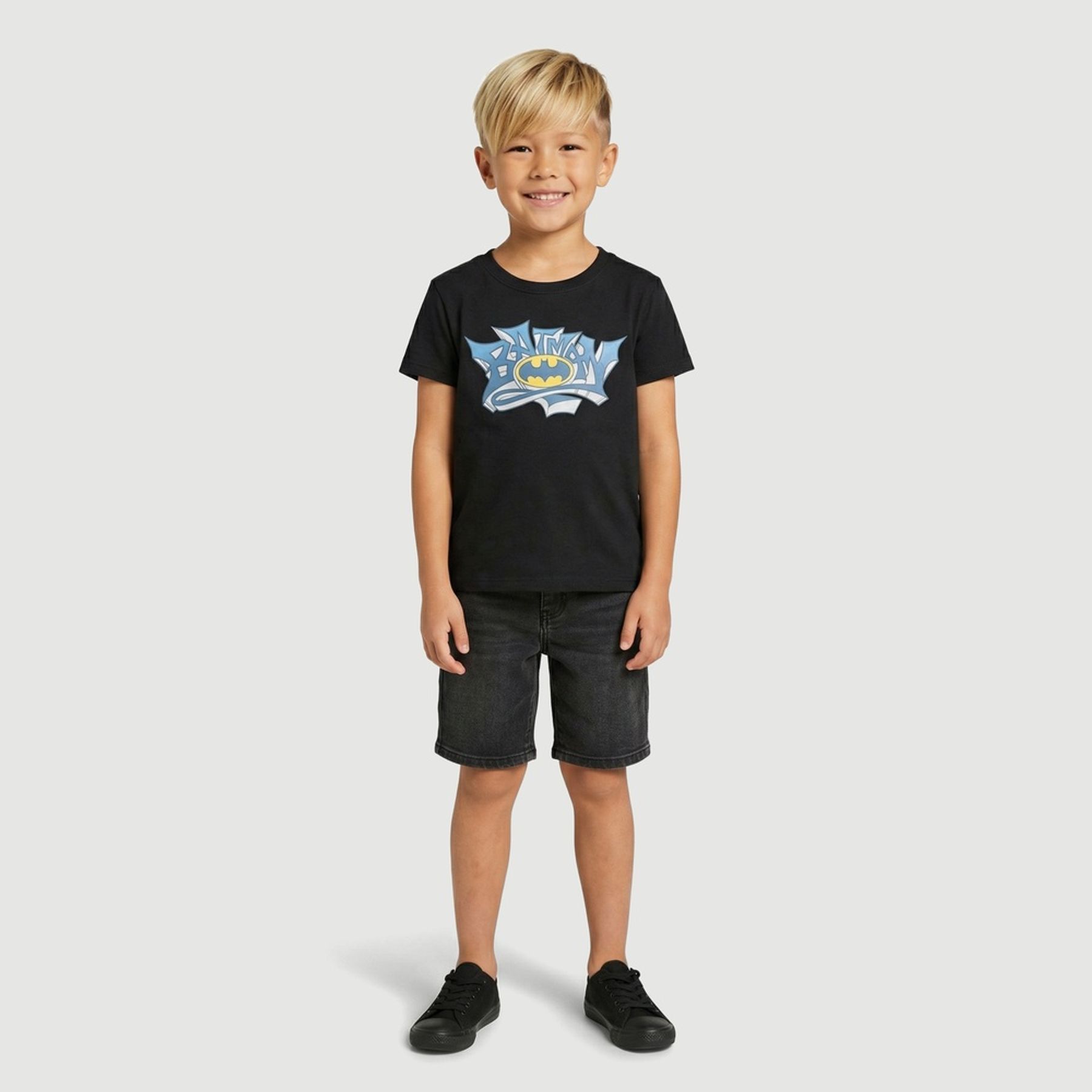 A peça traz estampa frontal centralizada com símbolo do Batman e lettering em estilo grafite, com detalhes em tons de azul. A gola redonda e a manga curta completam o design versátil, perfeito para combinar com jeans, bermuda e tênis.