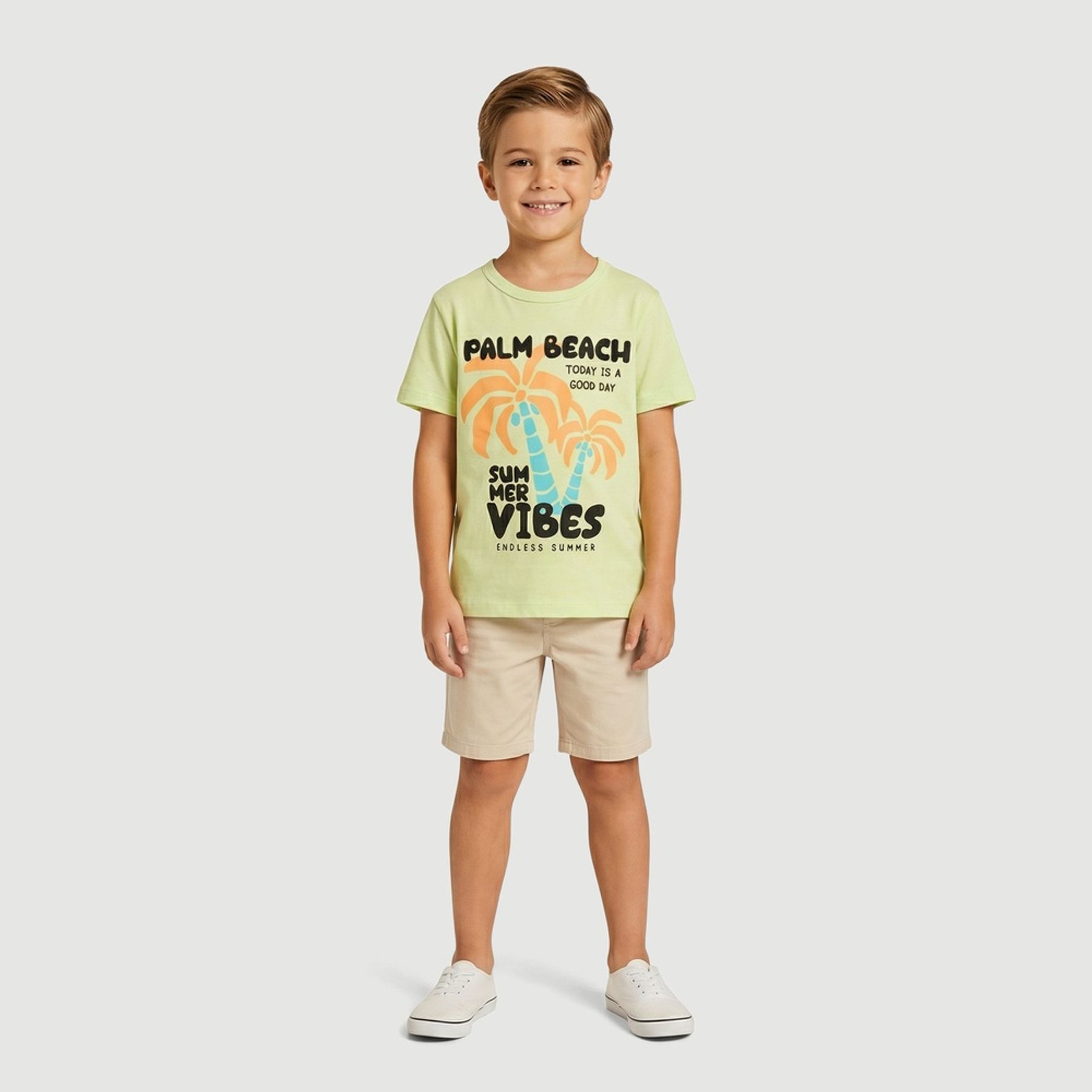 A estampa frontal centralizada traz frases em inglês e ilustração de palmeiras com inspiração tropical de Palm Beach. Em verde claro com detalhes contrastantes, é uma ótima opção para passeios e momentos de lazer, combinando bem com bermuda ou jeans.