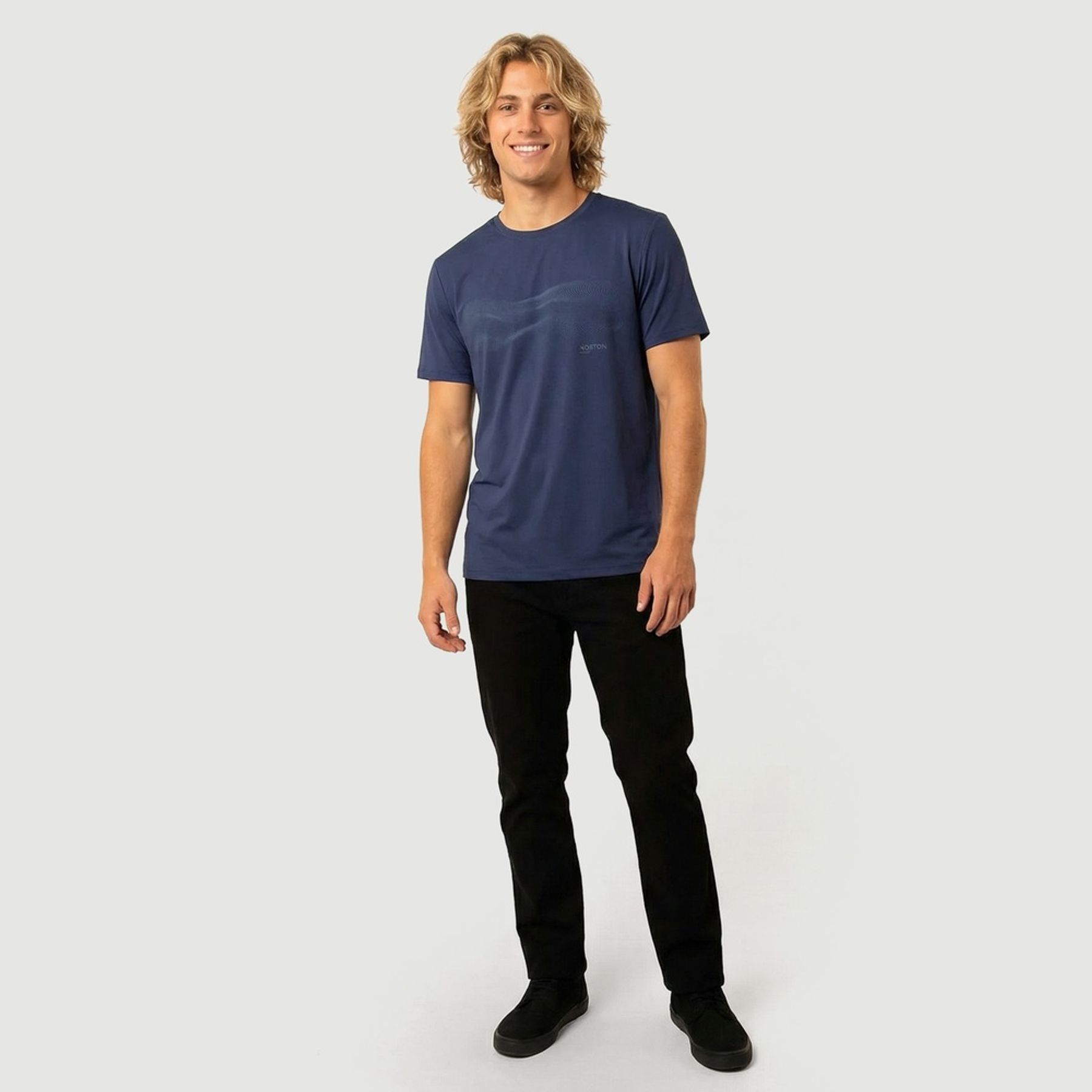 O design traz logo discreto no peito e grafismo tonal em baixo relevo na parte frontal, adicionando estilo com sobriedade. A gola redonda e a barra simples completam o acabamento limpo e versátil.