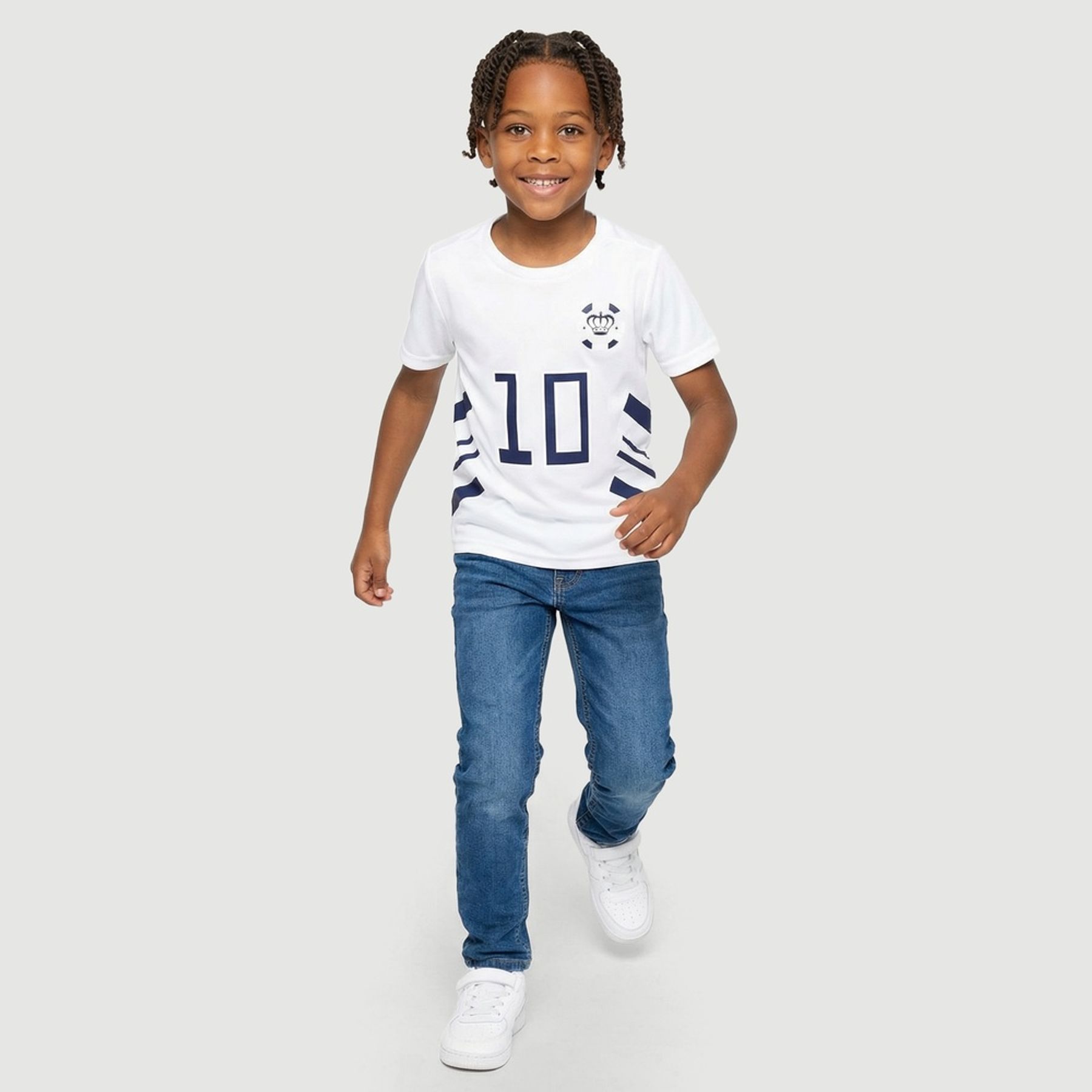 O destaque fica para a estampa frontal com número 10 e emblema de coroa, além das listras laterais em preto e branco, que reforçam o estilo esportivo. Cor creme (off white), fácil de combinar com bermudas e calças.