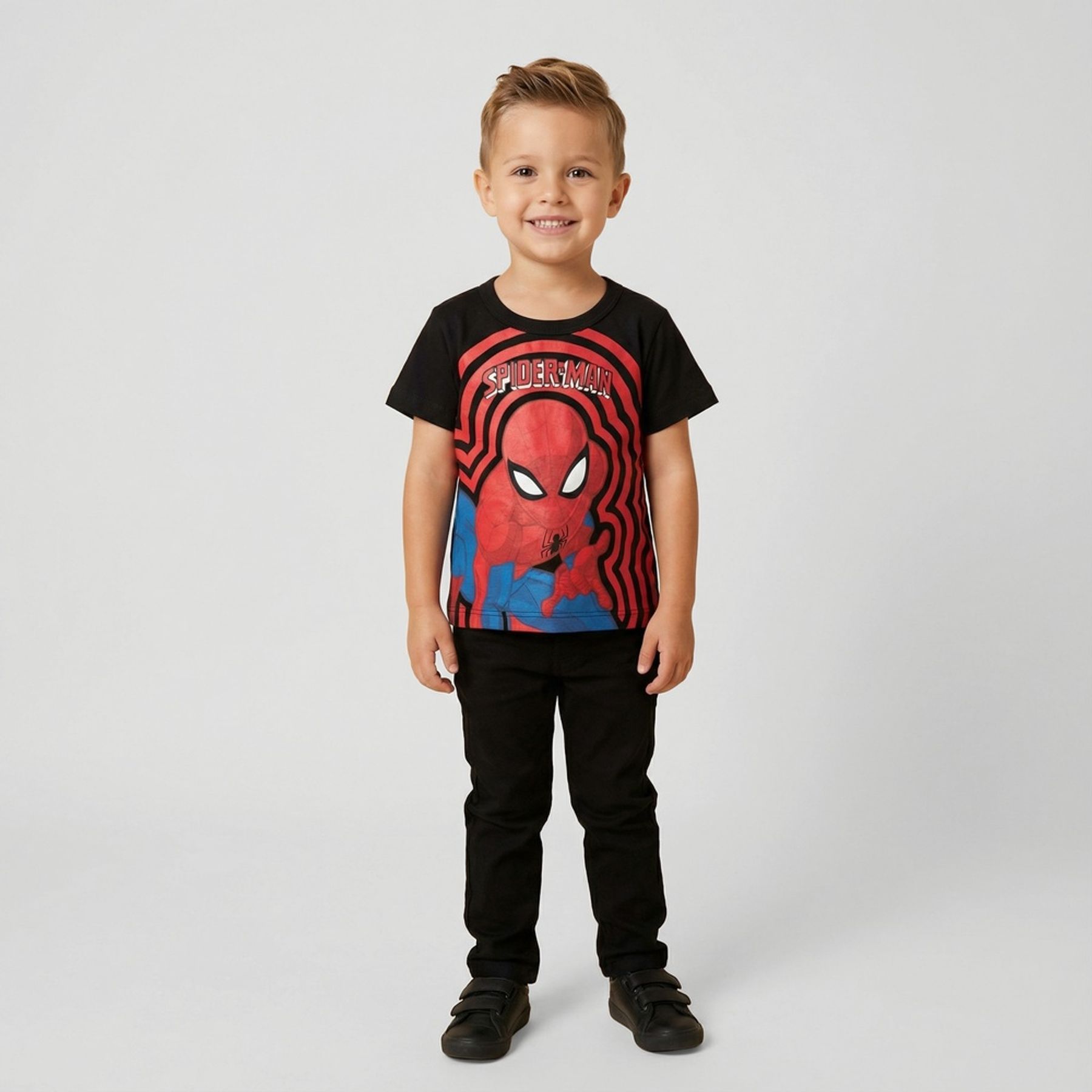 Economia de R$ 2,60Camiseta preta com estampa frontal grande do Spider-Man e grafismos contrastantes, ideal para compor produções descontraídas. Confeccionada em malha mista com predominância de algodão, tem toque agradável e boa respirabilidade. A modelagem com manga curta e gola redonda completa o visual, com acabamento de barra simples.