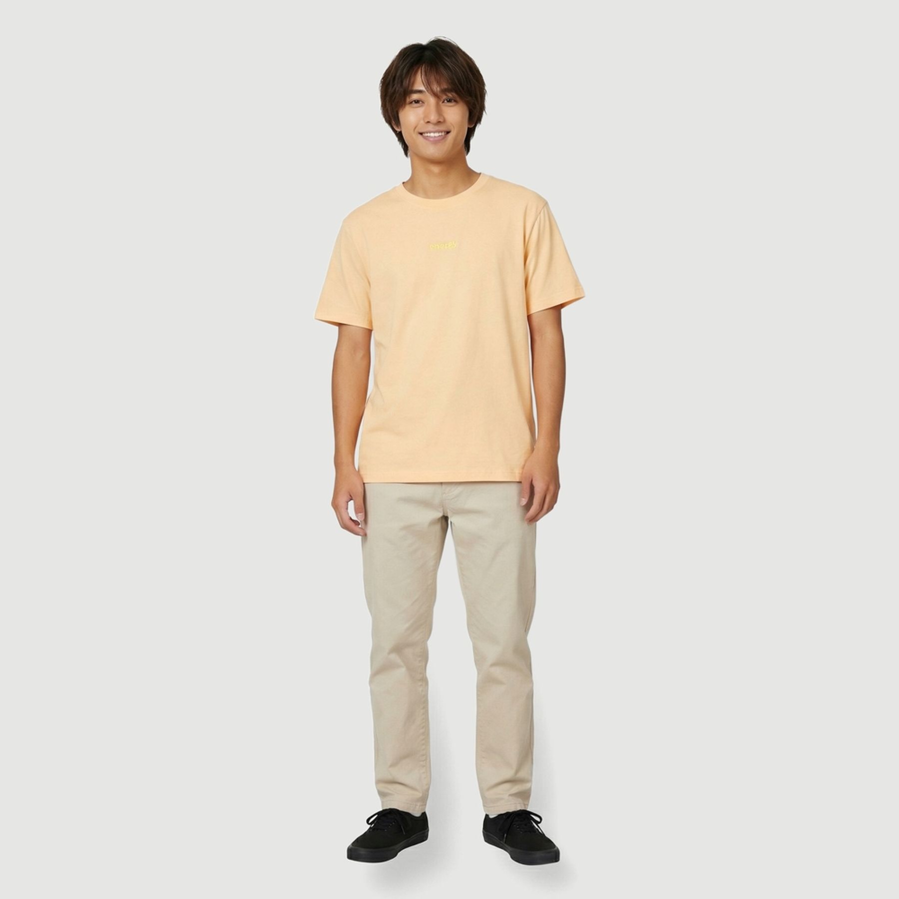 Com manga curta, gola redonda em ribana e barra simples, tem visual minimalista em tom bege. A estampa localizada com a palavra “energy” em amarelo adiciona um ponto de destaque discreto ao look.