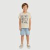 O destaque fica por conta da estampa frontal centralizada com temática de skate e frases em azul marinho, criando contraste moderno com o fundo bege. A peça tem gola redonda, manga curta e modelagem reta, ideal para combinar com jeans, bermudas e tênis.