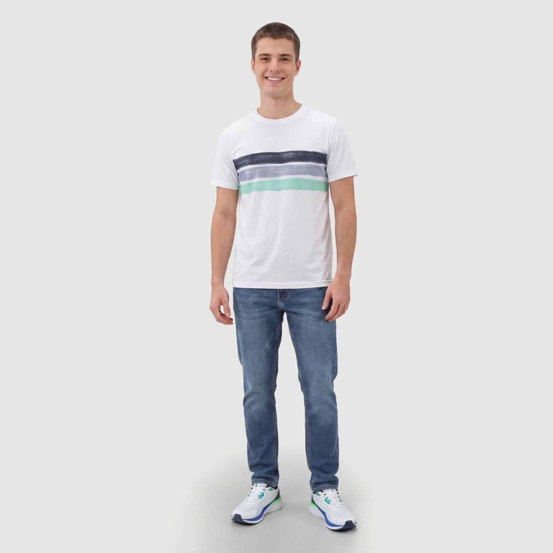 Economia de R$ 5,00Camiseta masculina Id Praia confeccionada em malha 100% algodão, com manga curta e gola redonda. A peça traz fundo branco com textura de micro listras e listras horizontais frontais em efeito aquarela em tons de azul e verde, criando um visual leve e versátil. Finaliza com etiqueta aplicada na barra inferior.